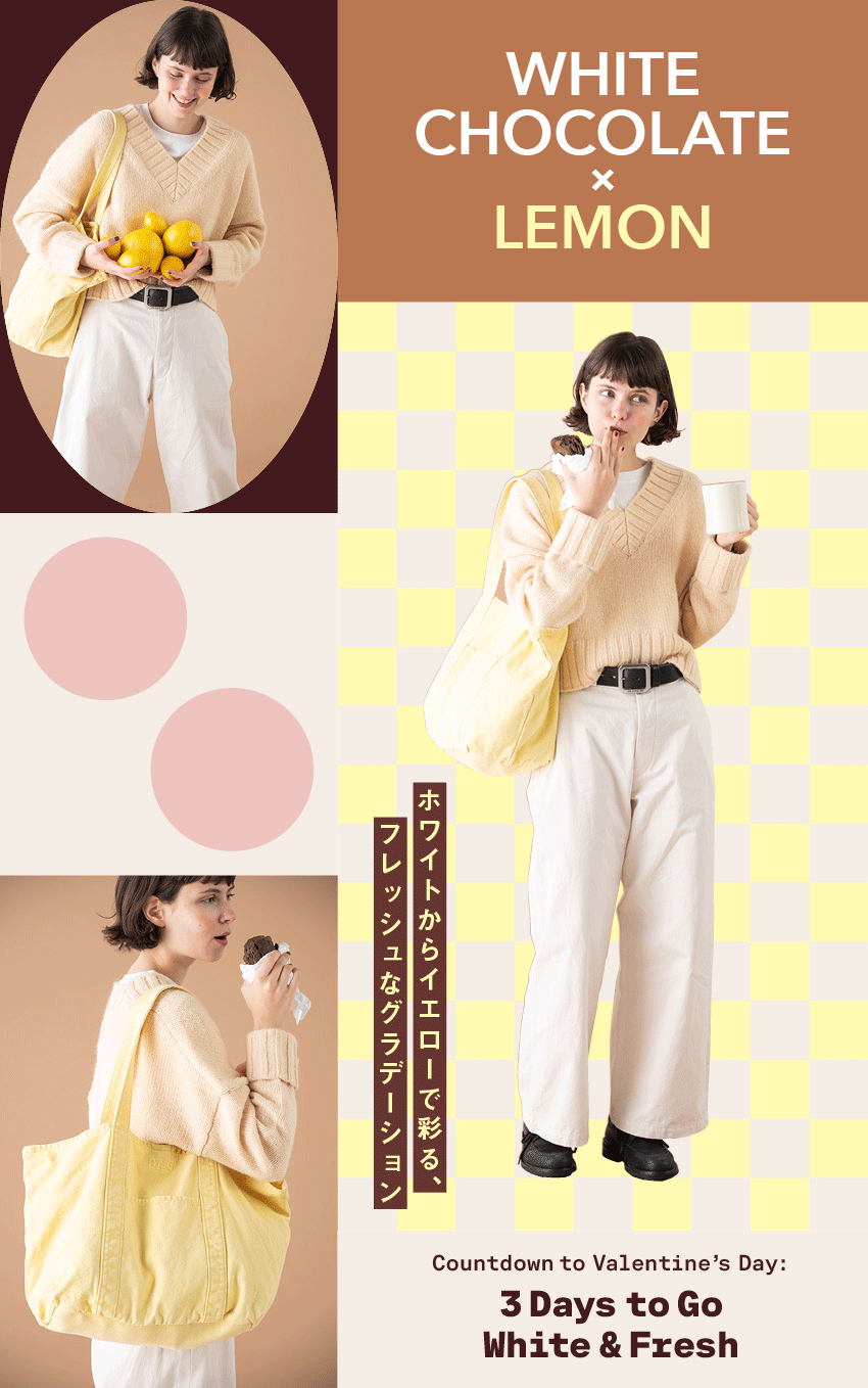数日前の哲学書は諦めて、バレンタインデーはフレッシュな気持ちで挑もうと、行きつけのカフェでコーヒーとチョコレートデニッシュをテイクアウト。そんな気持ちが表されているかのような、ホワイトチョコレートを感じさせるピュアなオフホワイトが本日の主役カラー。さわやかなレモンカラーをグラデーションで配したらとっても新鮮!ぼんやりしないようにベルトで締めるのがコツ。