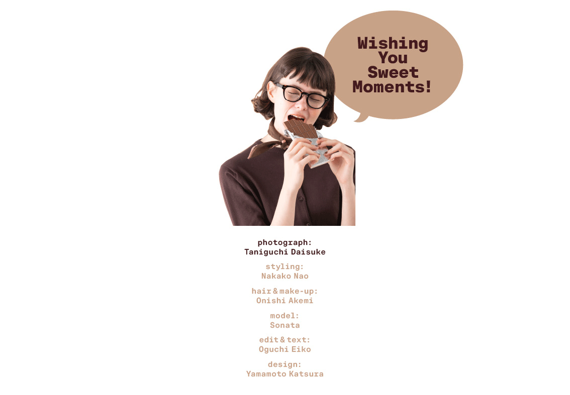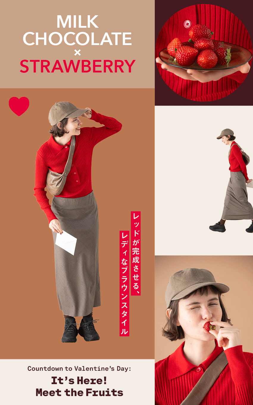 いよいよバレンタインデー当日。ちょっと恥ずかしいけれど想いをしたためた手紙を持っているSonataは、待ち合わせ場所に先に着いたけれど落ち着かない様子。コクのある洗練されたミルクチョコレートと合わせるのは、ストロベリーのようなときめきのある赤。甘くなりすぎないように、ボーイなニットポロで取り入れて。レディのバランスを取るには、キャップやショルダーバッグで外すのもポイント。