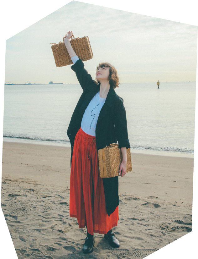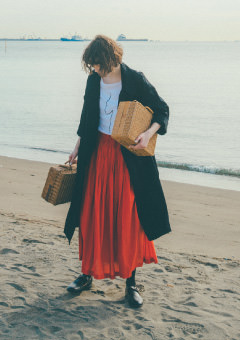 モノトーンコーデに、赤いフレアスカートをひとさじ。こんな風にインパクトのある赤アイテムを差し色にプラスすると、着こなしにメリハリをつけられます。オーガニックコットンを使用した《メゾン ド ソイル》のスカートは、穿き心地も抜群!