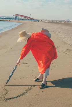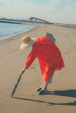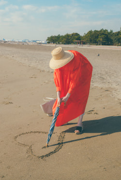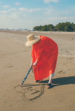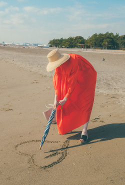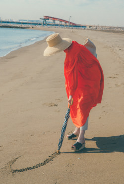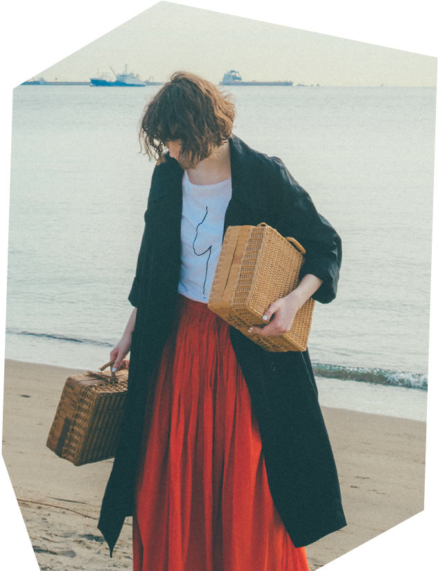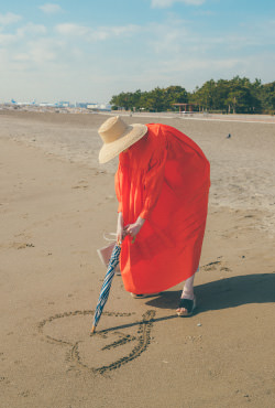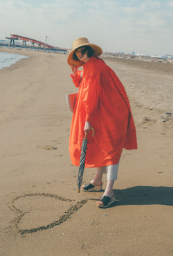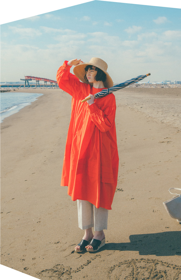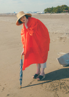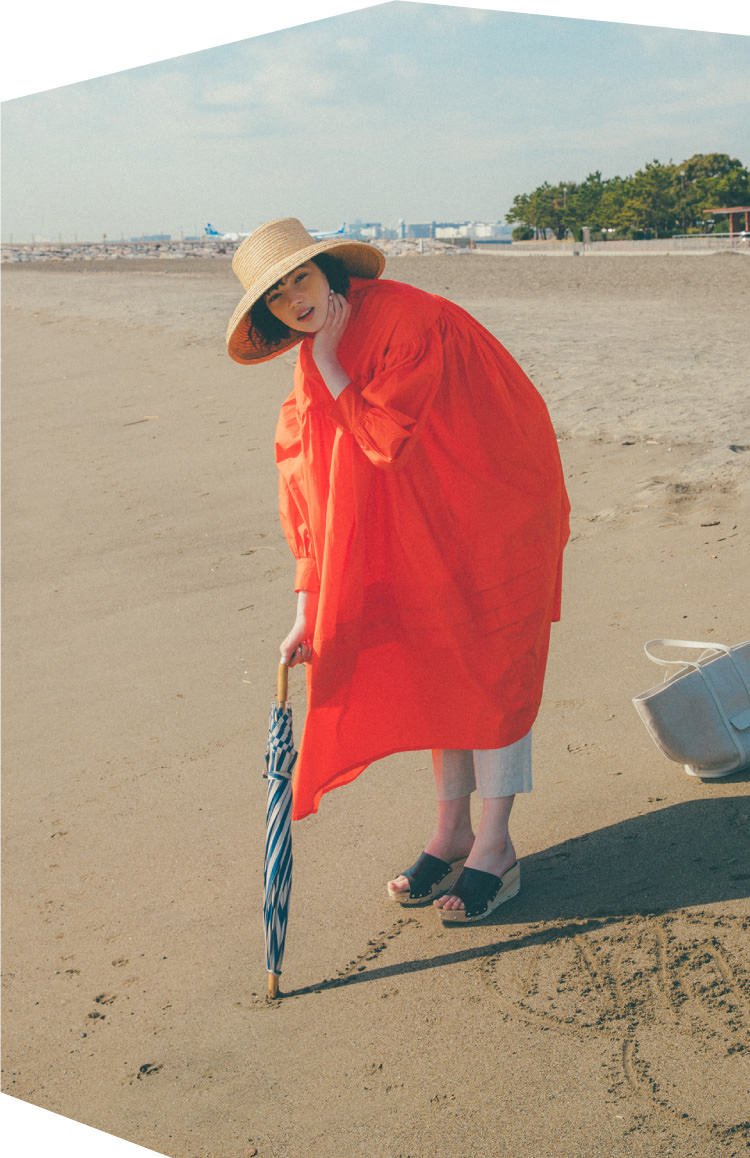 たっぽりした袖が可愛い赤ワンピースをコーデの主役に抜擢。ストンと一枚で着るのもいいけれど、軽やかな素材のパンツをレイヤードすると、より新鮮なムードで着こなせます。プリムの広い麦わら帽子をかぶれば、強い日差しも怖くない!