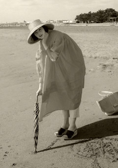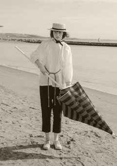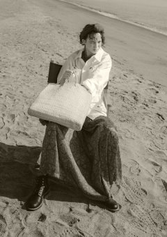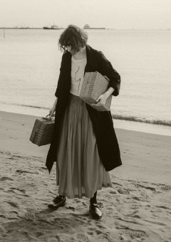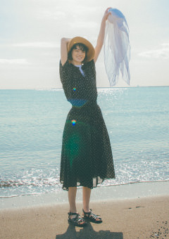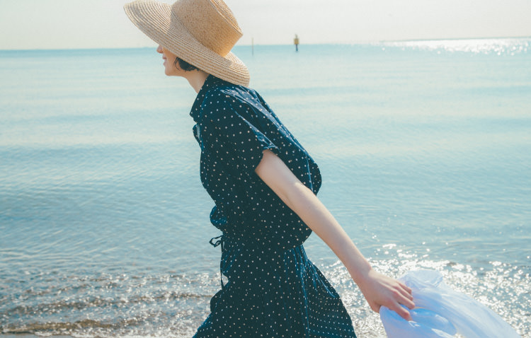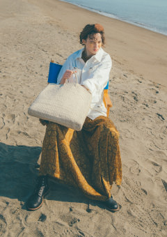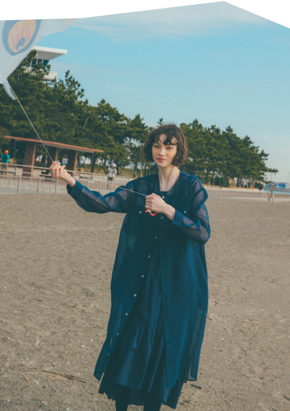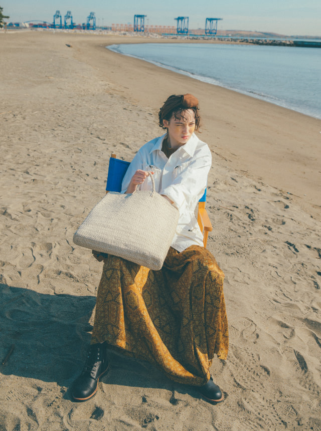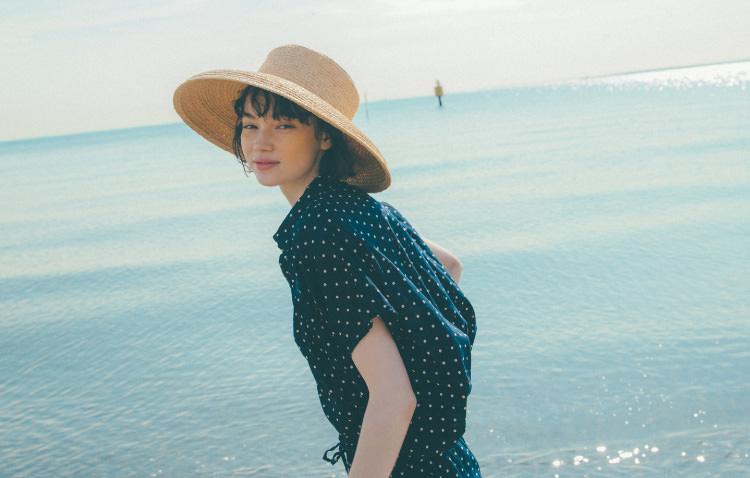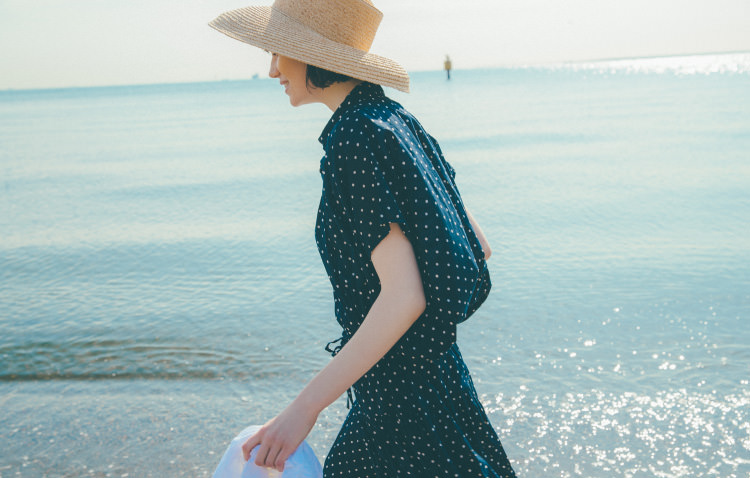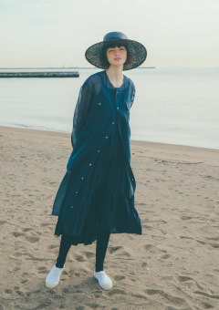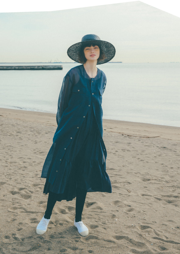 パリジェンヌのバカンスの定番、つば広ハット&ワンピースをFUDGE流に味付け。トレンドのシアーなシャツワンピースには、ノースリーブワンピースを重ねて鮮度をさらにUP。全身をネイビーのワントーンでまとめつつ、足元は白のスニーカーで抜け感を出すとバランスよく仕上がります。