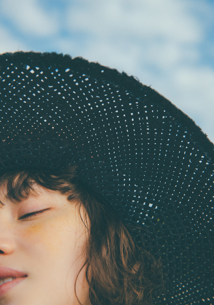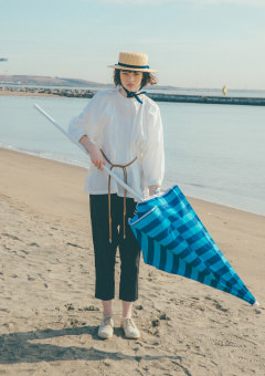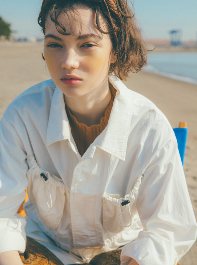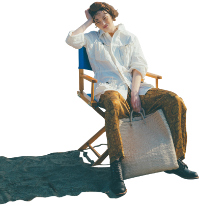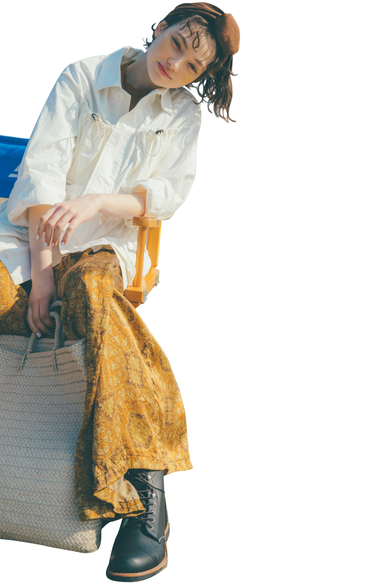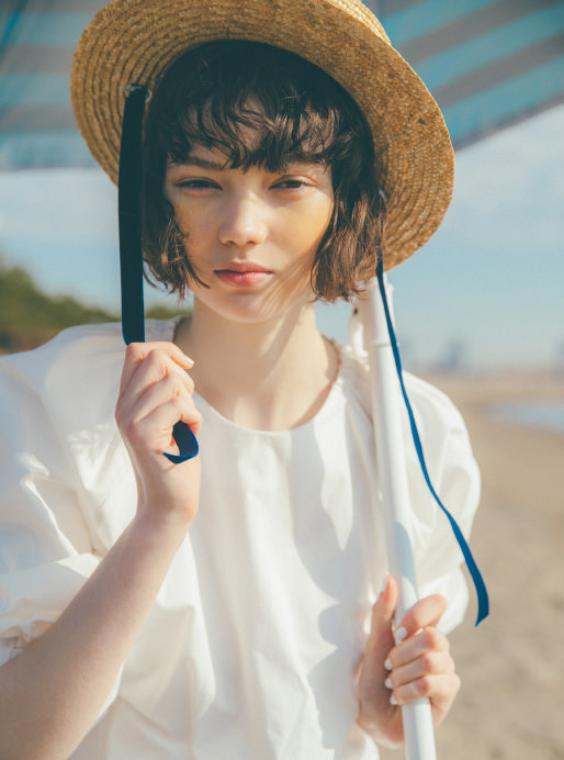 ウエストベルトの締め方次第でいろんな表情を楽しめる《ミュラー オブヨシオクボ》のブラウスに、クロップドパンツを合わせたワン・ツーコーデ。カンカン帽をかぶってドレスダウンすれば、オフの日にぴったりのリラクシーな装いに。