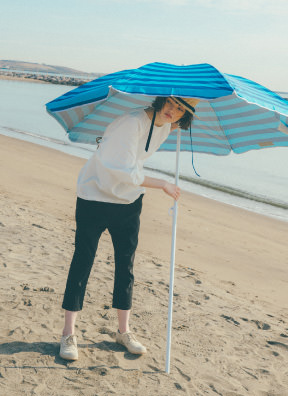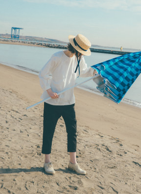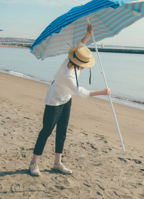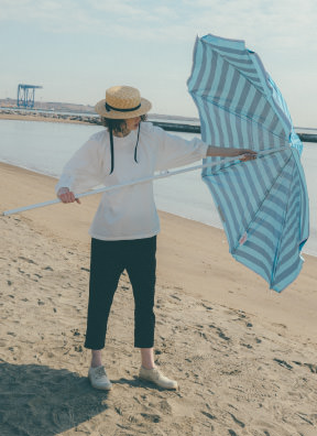 ウエストベルトの締め方次第でいろんな表情を楽しめる《ミュラー オブヨシオクボ》のブラウスに、クロップドパンツを合わせたワン・ツーコーデ。カンカン帽をかぶってドレスダウンすれば、オフの日にぴったりのリラクシーな装いに。
