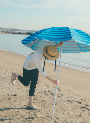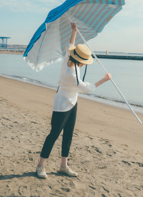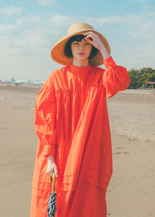 たっぽりした袖が可愛い赤ワンピースをコーデの主役に抜擢。ストンと一枚で着るのもいいけれど、軽やかな素材のパンツをレイヤードすると、より新鮮なムードで着こなせます。プリムの広い麦わら帽子をかぶれば、強い日差しも怖くない!