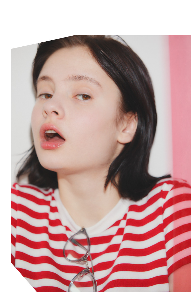 カジュアルなボーダーTシャツにほんのり血色感を漂わせることで、大人可愛い色っぽさもプラスしてくれます。