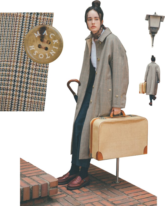 コート¥180000/MACKINTOSH(マッキントッシュ青山店)、ポロシャツ¥12000/FRED PERRY(フレッドペリーショップ東京)、スカーフ¥13800/Vincenzo Miozza(真下商事)、デニムパンツ¥19000/NEPLA.(エンケル)、アンブレラ¥27000/FOX UMBRELLAS(グリニッジ ショールーム)、シューズ¥63000/Paraboot(パラブーツ青山店)