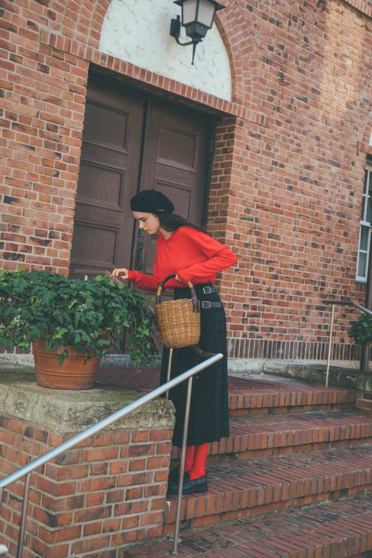 セーター¥19000/Peter Geeson(グラストンベリーショールーム)、スカート¥26800/O’NEIL OF DUBLIN(ビショップ)、ベレー¥8500/ORCIVAL(ビショップ)、シューズ ¥63000/Paraboot(パラブーツ青山店)、その他 スタイリスト私物