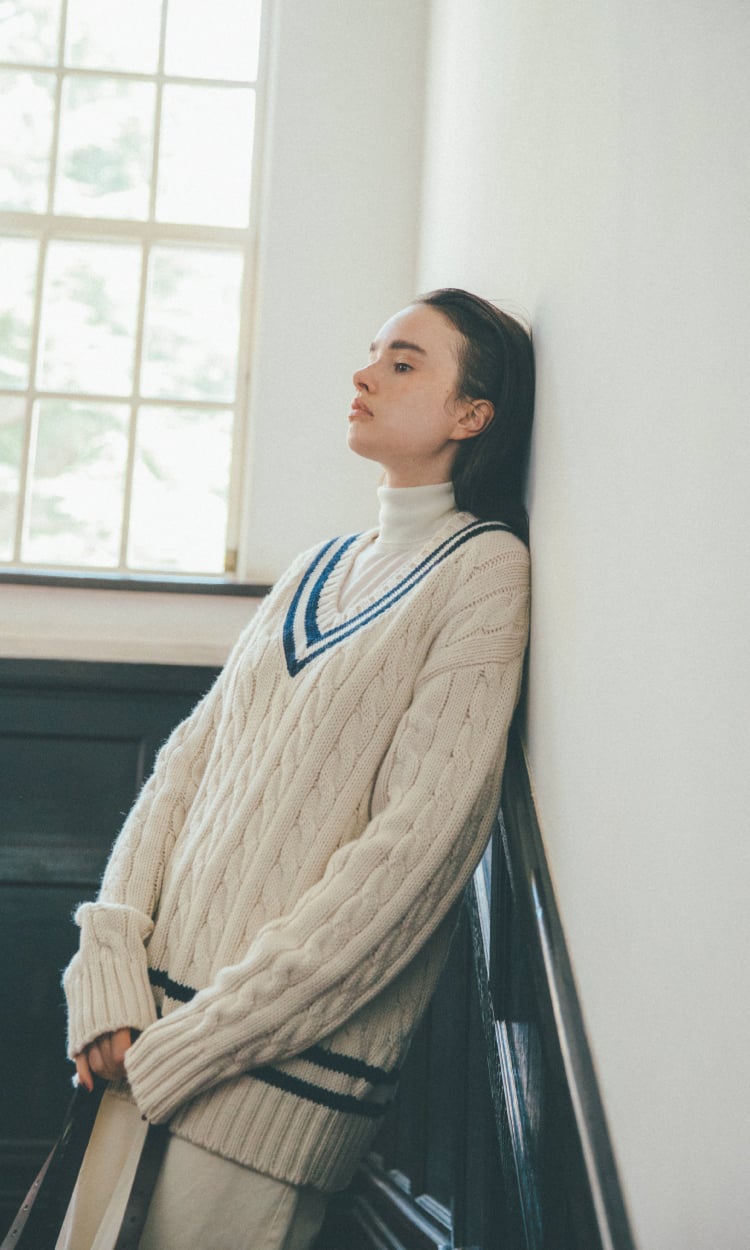 インナーとの重ね着を考えるのも楽しい、秋口から真冬まで重宝するチルデンセーター。学生っぽくならずに大人の女性が着るには…?ハイネックのインナーを選んで、白でまとめると洗練されたクラシックスタイルに。