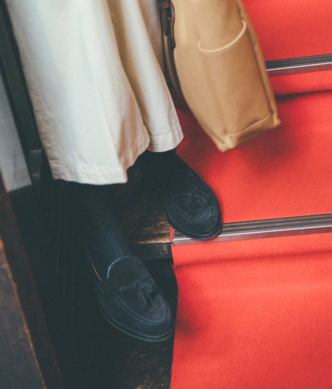 ともすると真面目でオーソドックスな雰囲気になりすぎるチルデンセーターには、表情豊かなタッセルローファーを合わせて遊び心を忘れない。