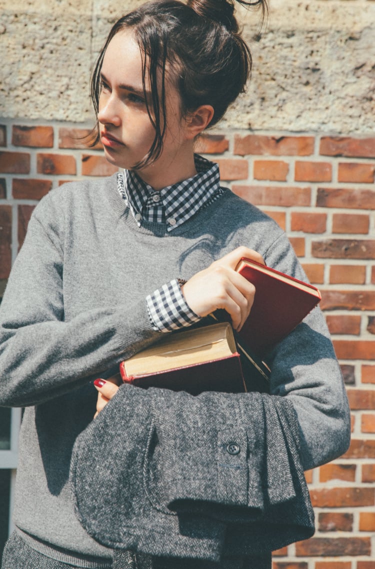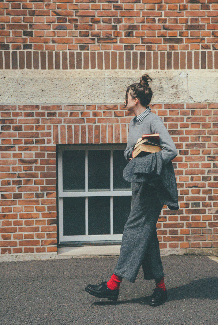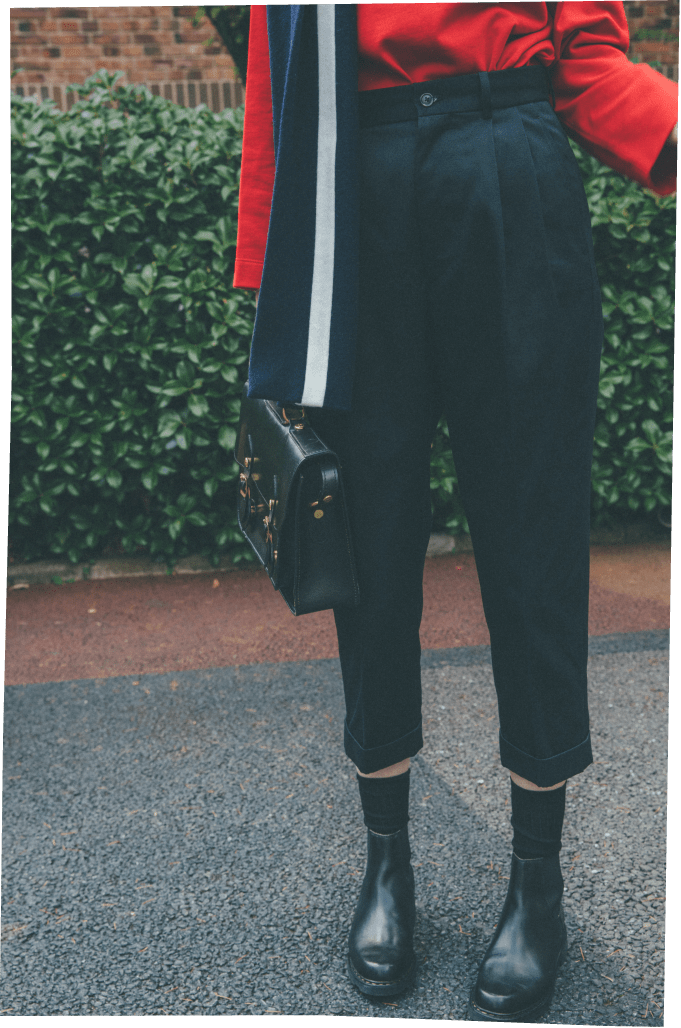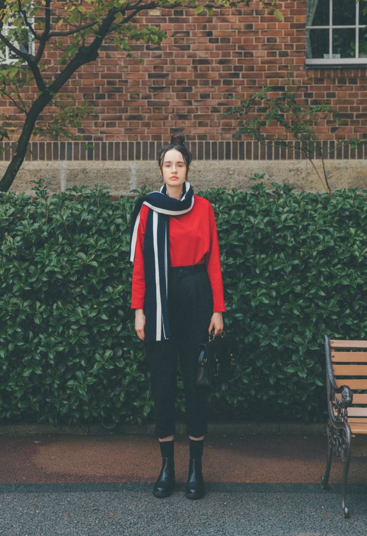 シルエットをすっきり見せてくれるキレイめなセンタープレスパンツだからこそ、合わせるアイテムは少しだけハリー・ポッターを意識してみたり!? スクールテイストを取り入れることで、知的で愛らしいハンサムガールに。
