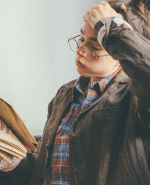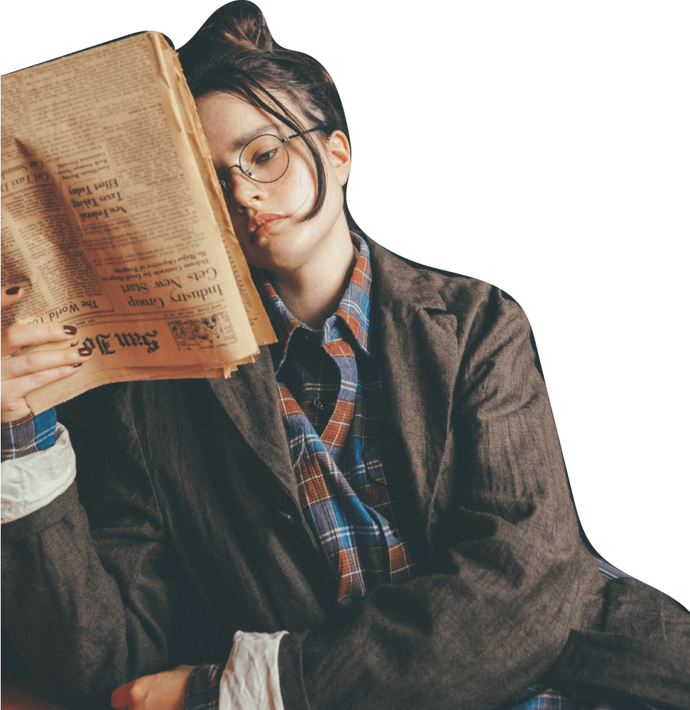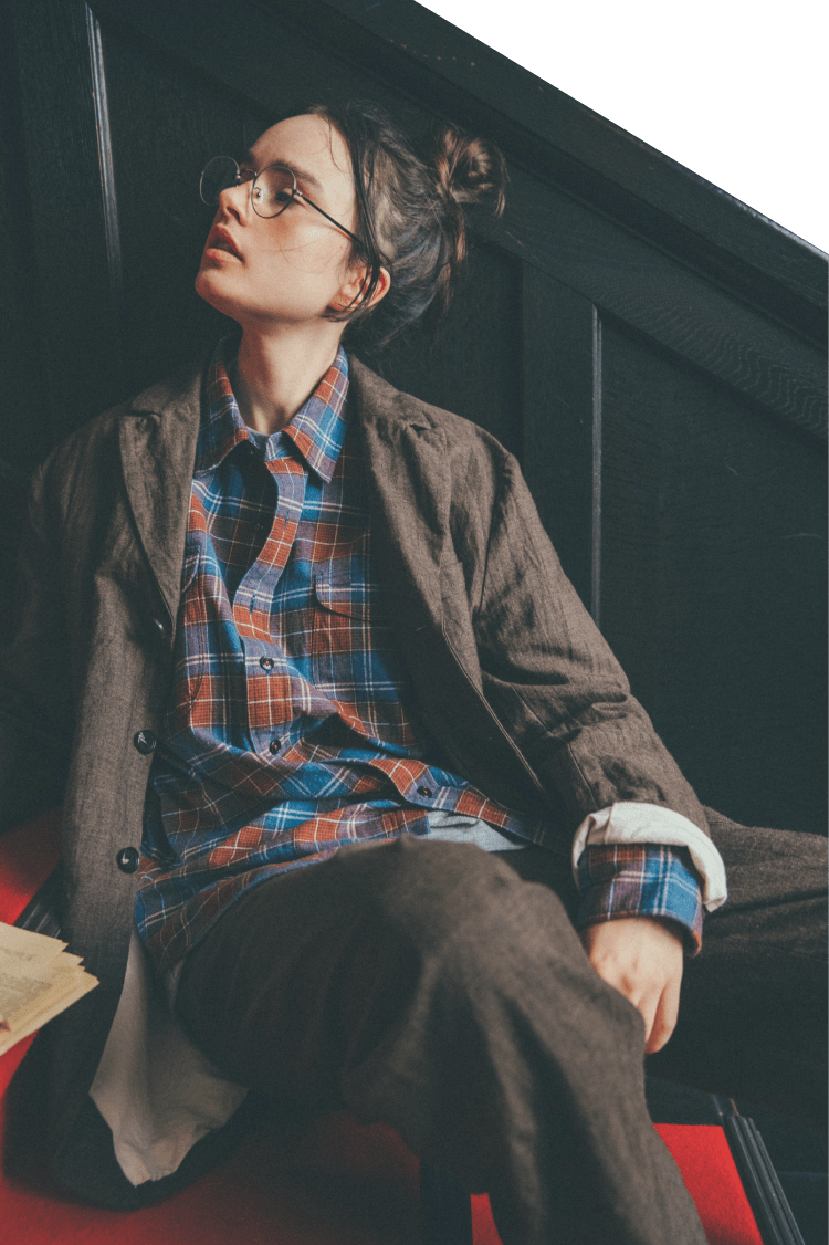 メタル素材のボストンフレームメガネはクラシックなデザインでかけやすく、コーディネートのポイントとしてもほどよいさじ加減。ゆるっとしたセットアップに加えてギークガール風に。