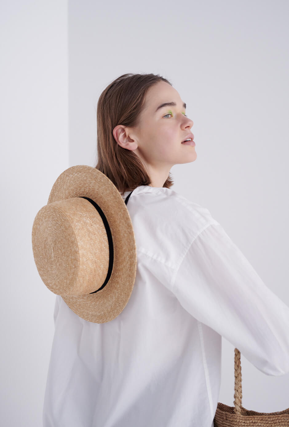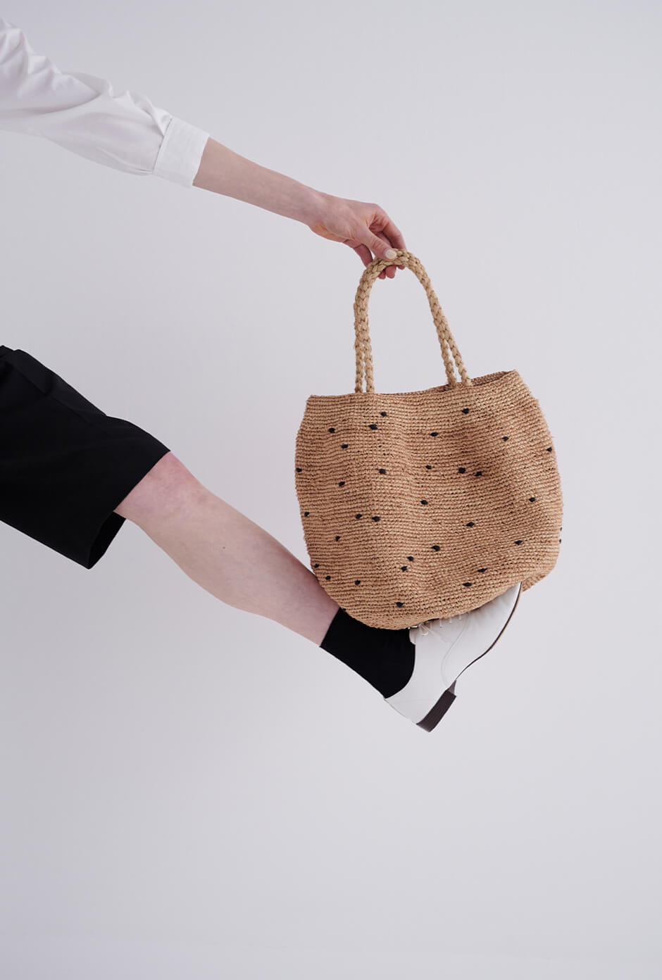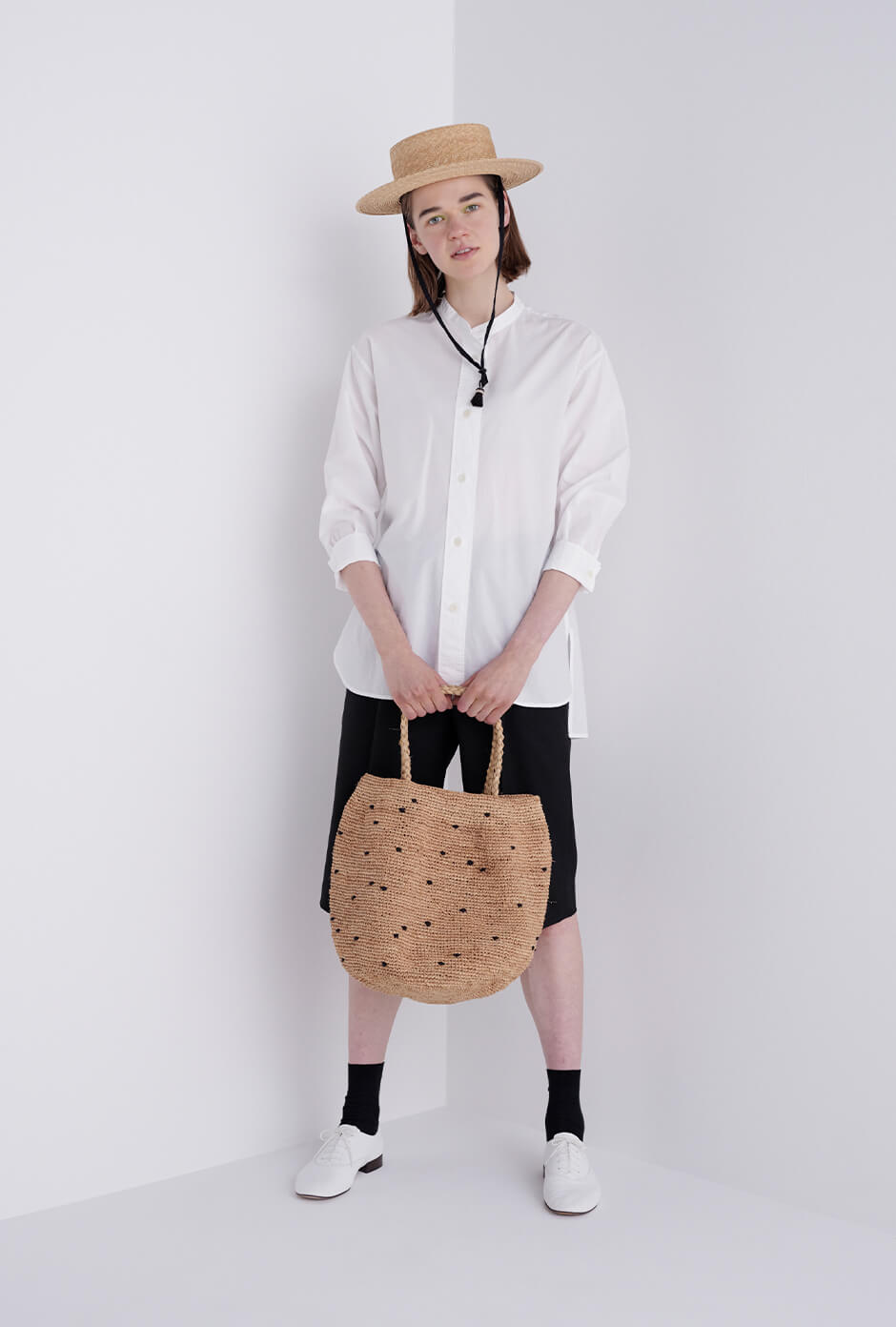 さらりと着こなしたい白シャツ+ハーフパンツのスタイル。ストロー素材のハットとバッグを合わせて、素材感で夏らしさを演出。シンプルなコーディネートは、小物で変化をつけて。シャツ¥22000/MHL.(MHL.)、ショーツ¥30800/HYKE(ボウルズ)、カンカン帽¥34100/COMESANDGOES(アルファ PR)、バッグ¥34100/NORO(グラストンベリーショールーム)、ソックス¥2640/MARCOMONDE(マルコモンド渋谷パルコ店)、シューズ ¥40000(ルック ブティック事業部)