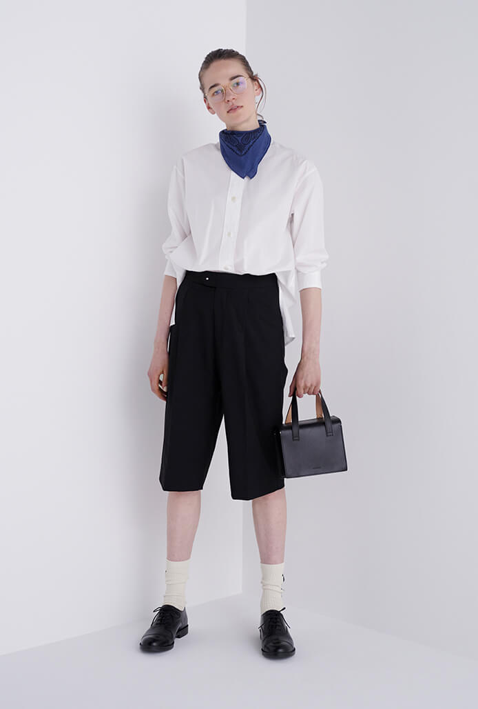 スタンドカラーシャツに変化をつけたいときは、首もとにボリュームをつけてワンポイントに。バンダナ¥15400/マーガレット・ハウエル(マーガレット・ハウエル)、眼鏡¥57200/AHLEM(グリーブスペックス エージェント)、バッグ¥37400/MARROW(シック)、ソックス¥3520/MARCOMONDE(マルコモンド渋谷パルコ店)、シューズ¥22,000/MOONSTAR(ムーンスター カスタマーセンター)