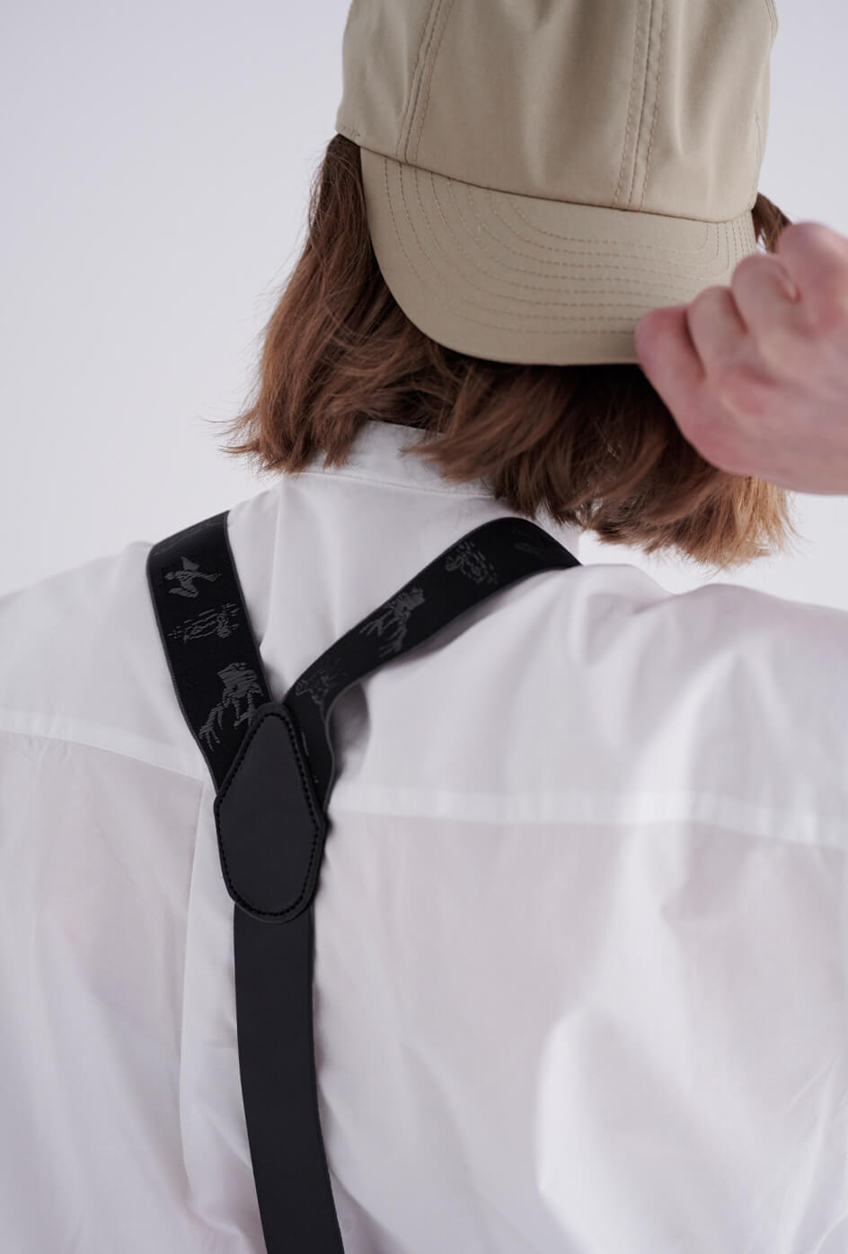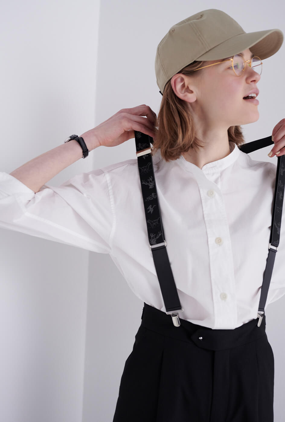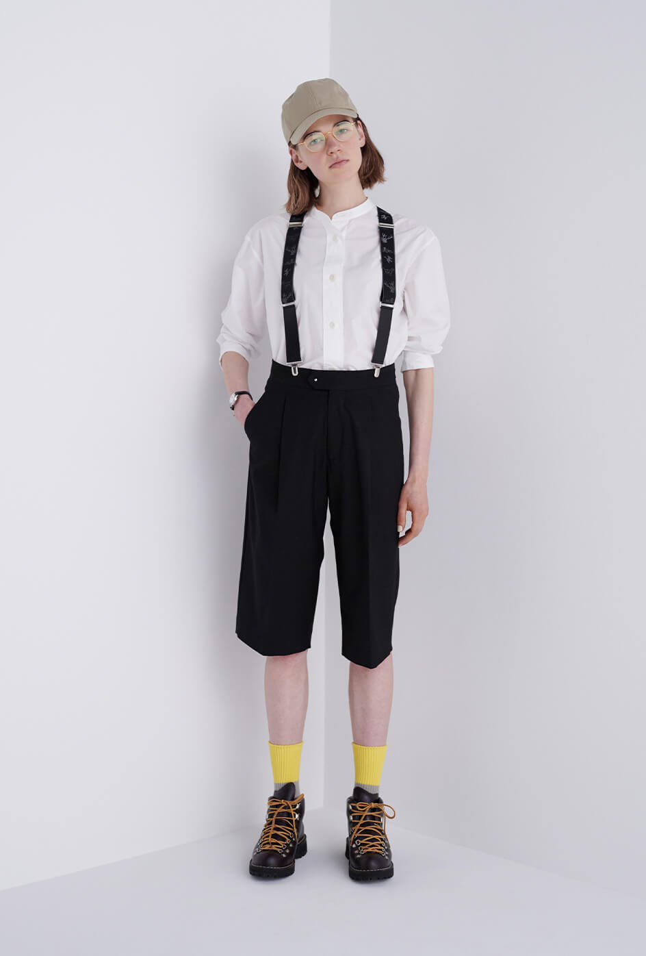 ゴアテックス素材のキャップとブーツで、突然の雨も備えあれば憂いなし。キャップ¥8800/THE NORTH FACE PURPLE LABEL(ナナミカ 代官山)、眼鏡¥44000/ayame(アヤメ)、時計¥36300/マーガレット・ハウエル(マーガレット・ハウエル)、サスペンダー¥4400/GEVAERT BANDWEVERIJ(ビームス ボーイ 原宿)、ソックス¥1980/Traditional Weatherwear(トラディショナル ウェザーウェア青山店)、ブーツ¥60500/Daner(ダナー)