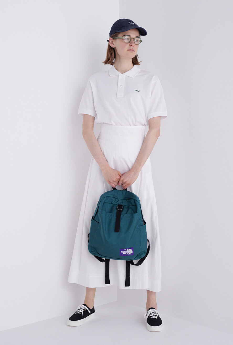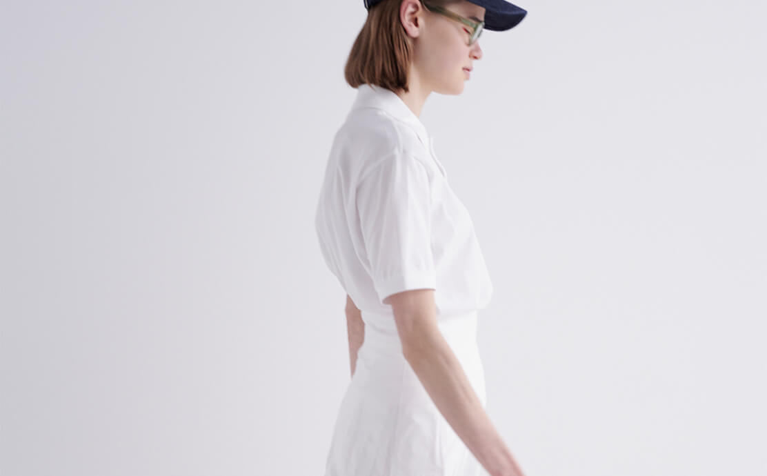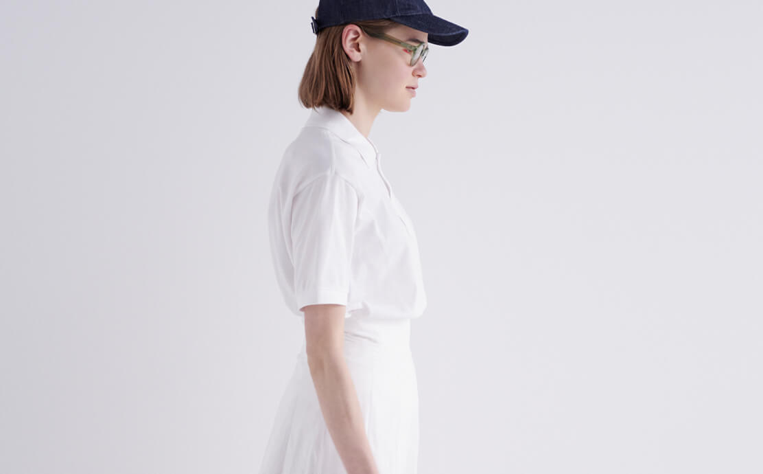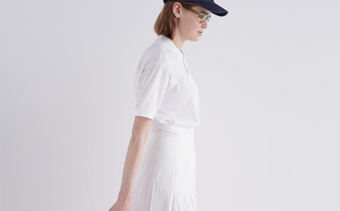 ポロシャツは、第一ボタンまでピシッと閉めるのがFUDGEガール的スタンダート。オールホワイトには、小物の色味でコーディネートを締めるのがお約束。ポロシャツ¥14300/LACOSTE(ラコステお客様センター)、スカート¥52800/Scye(マスターピースショールーム)、キャップ¥16500/A.P.C.( アー・ペー・セー カスタマーサービス)、ポロシャツ¥14300/LACOSTE(ラコステお客様センター)、眼鏡¥40700/Lasca LUNETIER(グローブスペックス エージェント)、リュック¥12,100/THE NORTH FACE PURPLE LABEL(ナナミカ 代官山)、スニーカー¥21450/ Maison Kitsuné (メゾン キツネ カスタマーセンター)