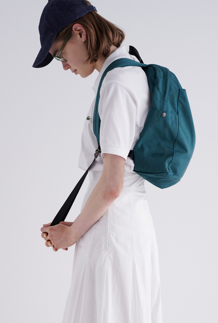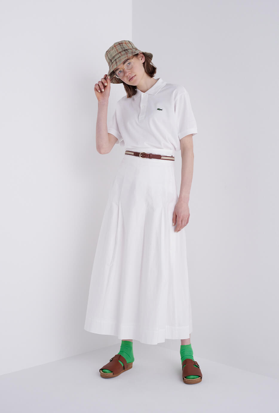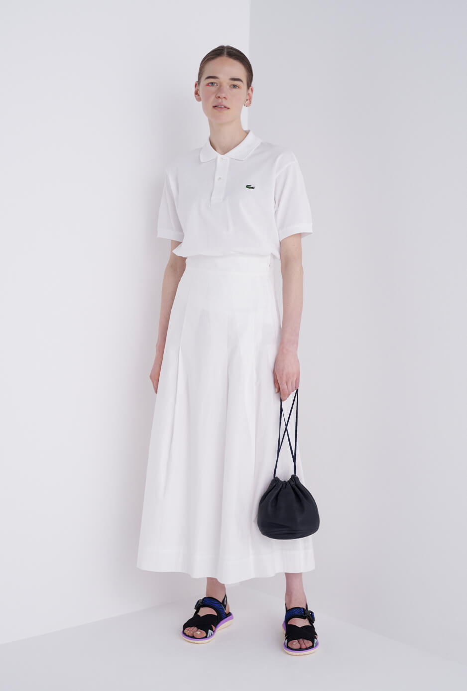 ポロシャツは、第一ボタンまでピシッと閉めるのがFUDGEガール的スタンダート。オールホワイトには、小物の色味でコーディネートを締めるのがお約束。ポロシャツ¥14300/LACOSTE(ラコステお客様センター)、スカート¥52800/Scye(マスターピースショールーム)、キャップ¥16500/A.P.C.( アー・ペー・セー カスタマーサービス)、ポロシャツ¥14300/LACOSTE(ラコステお客様センター)、眼鏡¥40700/Lasca LUNETIER(グローブスペックス エージェント)、リュック¥12,100/THE NORTH FACE PURPLE LABEL(ナナミカ 代官山)、スニーカー¥21450/ Maison Kitsuné (メゾン キツネ カスタマーセンター)