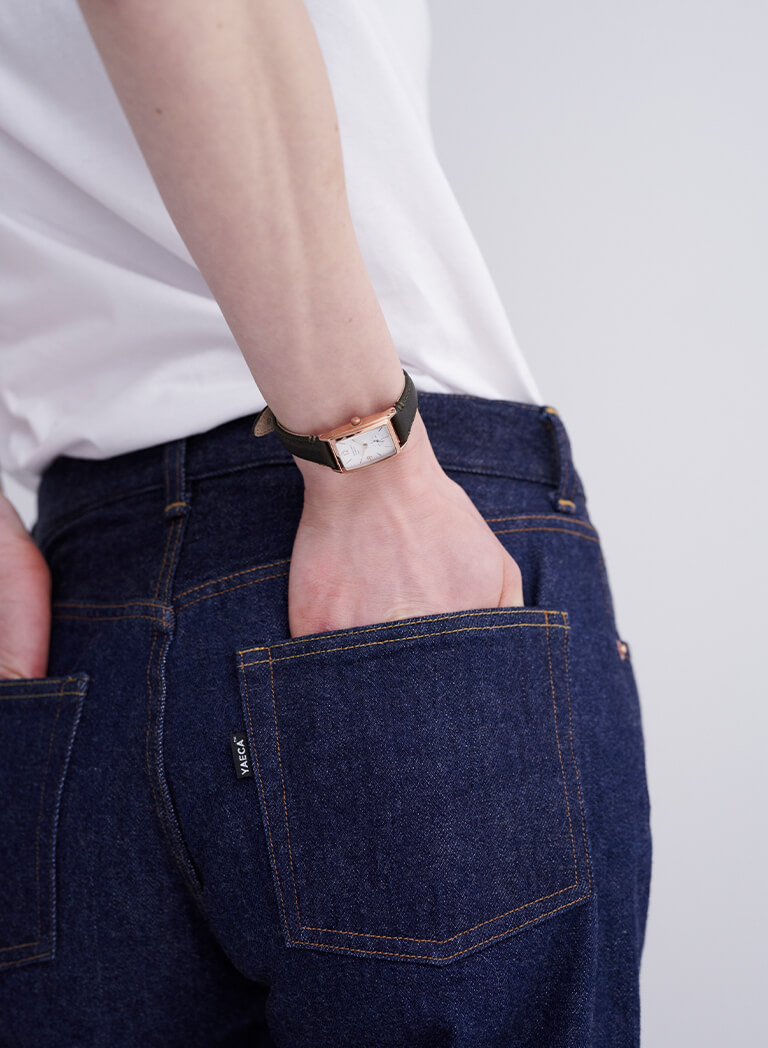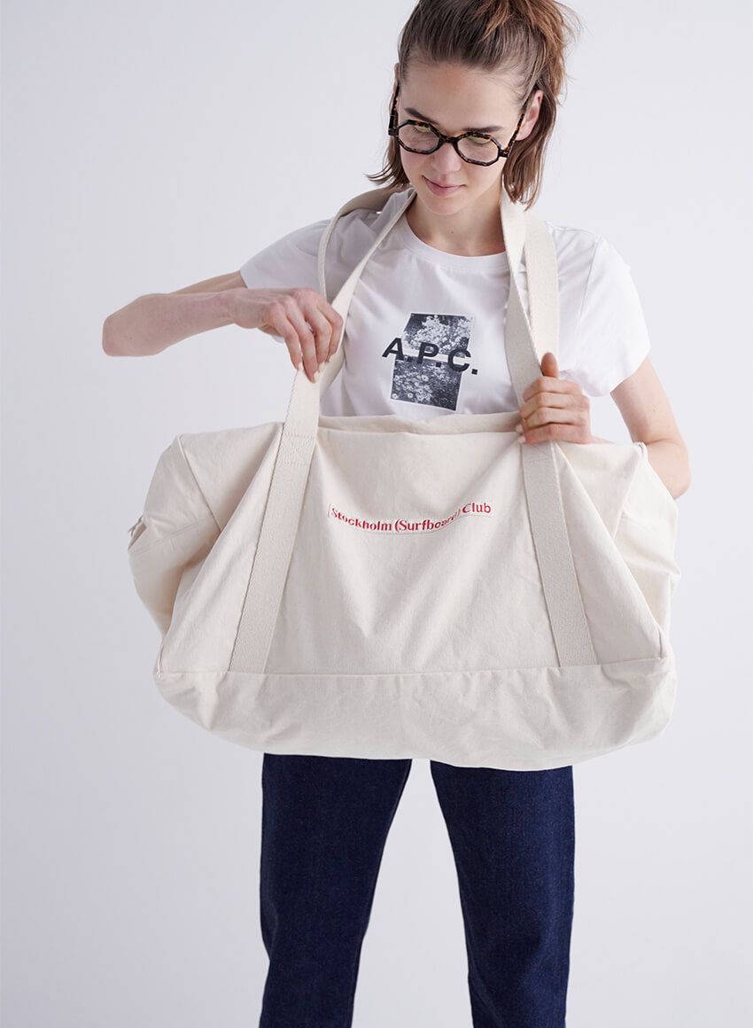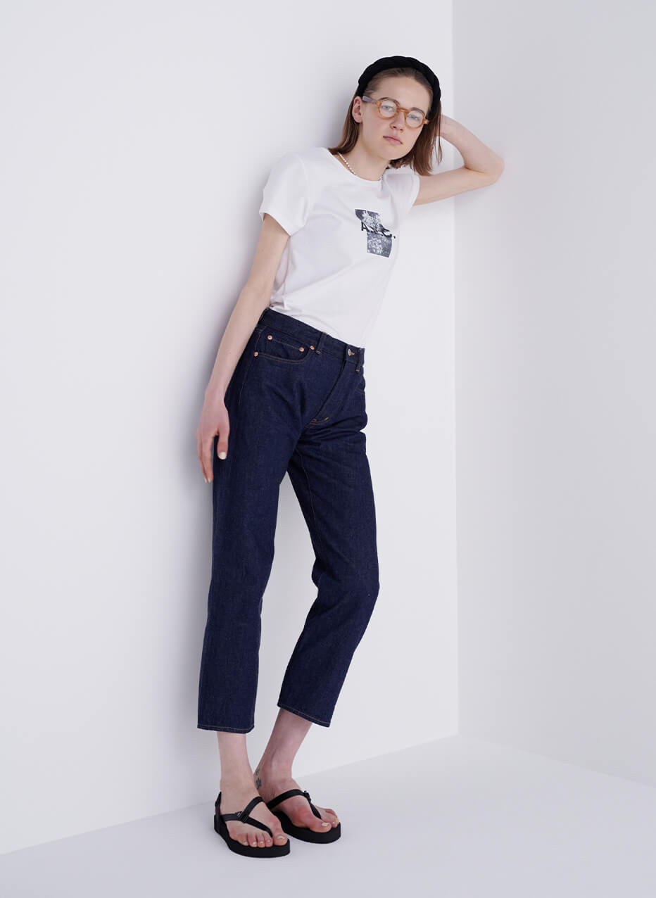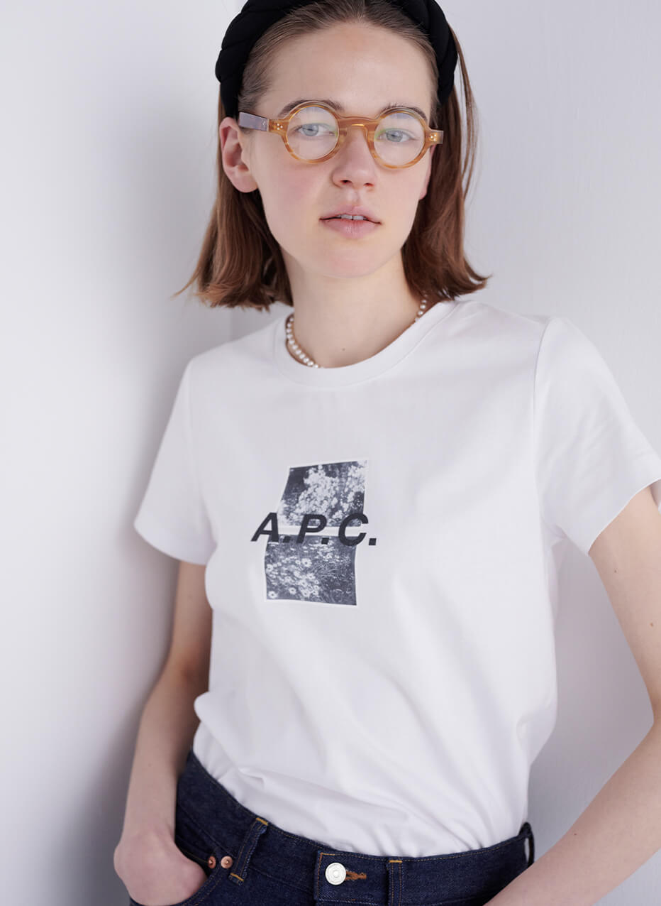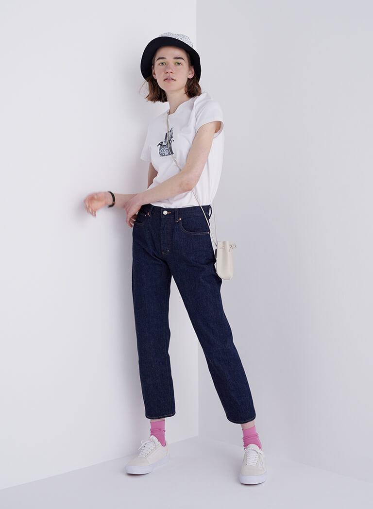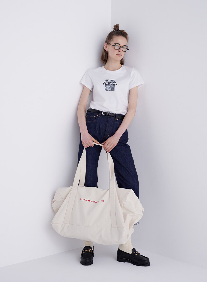基本の“き”である白Tシャツ+デニムの組み合わせ。ローファーに白ソックスで、メンズライクな着こなしに。Tシャツ¥13200/A.P.C.(アー・ペー・セー カスタマーサービス)、デニム¥19800/YAECA(ヤエカ アパートメント ストア)、多角形眼鏡¥34100/Ann et Valentin(グローブスペックス エージェント)、ベルト¥14000/Martin Faizey(グラストンベリーショールーム)、ソックス¥2860/YAECA(ヤエカショールーム)、ローファー¥74800/Paraboot(パラブーツ青山店)、ビッグバッグ¥18000/STOCKHOLM SURFBOARD CLUB(エドストローム オフィス)