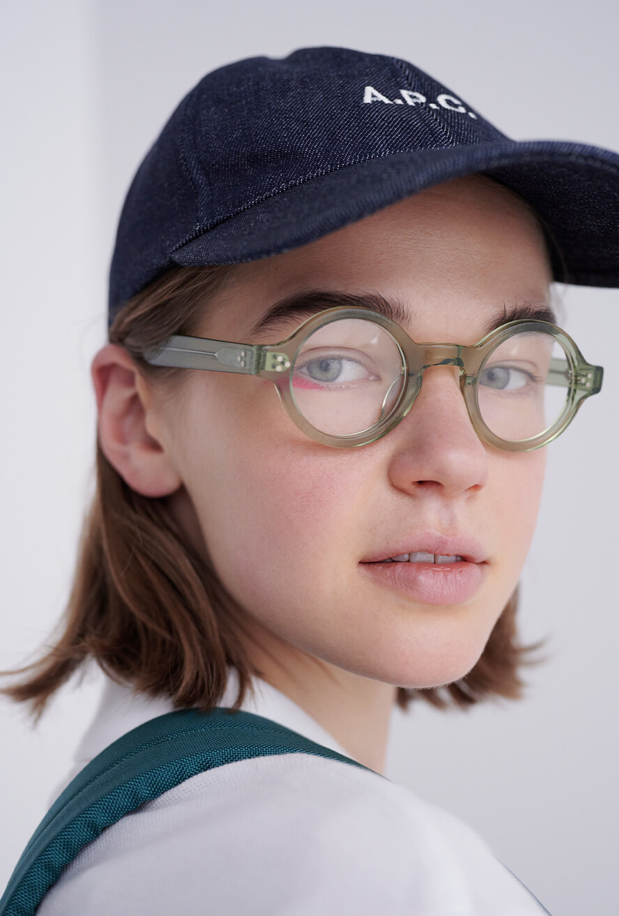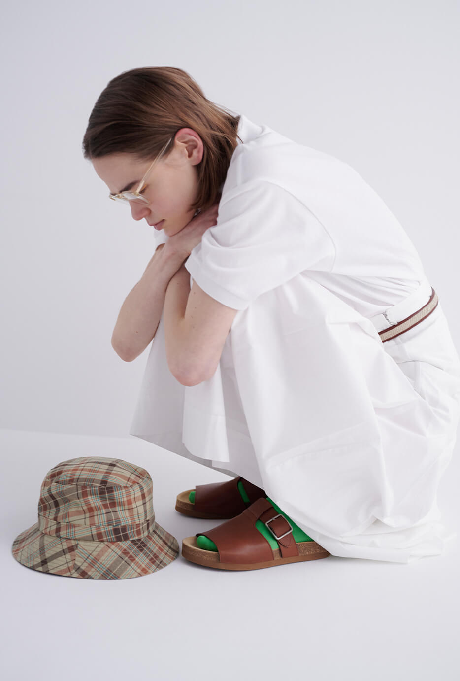 トレンドカラーのグリーンは足もとから取り入れる。ベーシックなカジュアルコーディネートをアップデート。チェックハット¥8140/THE NORTH FACE PURPLE LABEL(ナナミカ 代官山)、眼鏡¥32000/O.J.GLOWB SPECS OPTICAL Co.(グローブスペックス エージェント)、ベルト¥17600、サンダル¥38500/ともにA.P.C.(アー・ペー・セー カスタマーサービス)、ソックス¥1980/Traditional Weatherwear(トラディショナル ウェザーウェア 青山店)