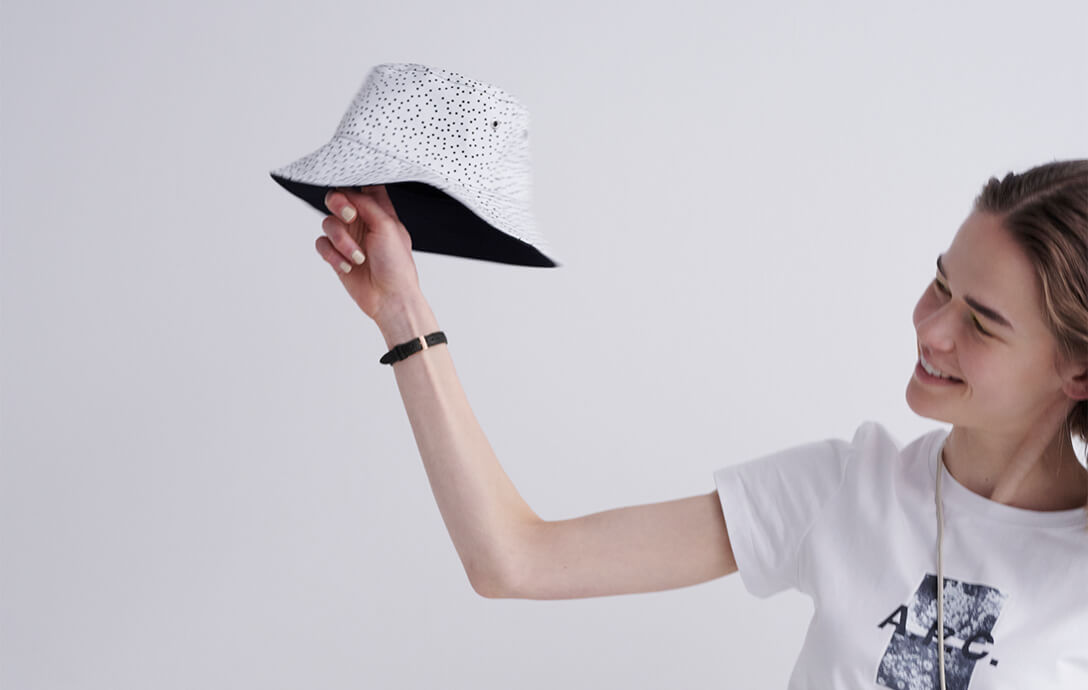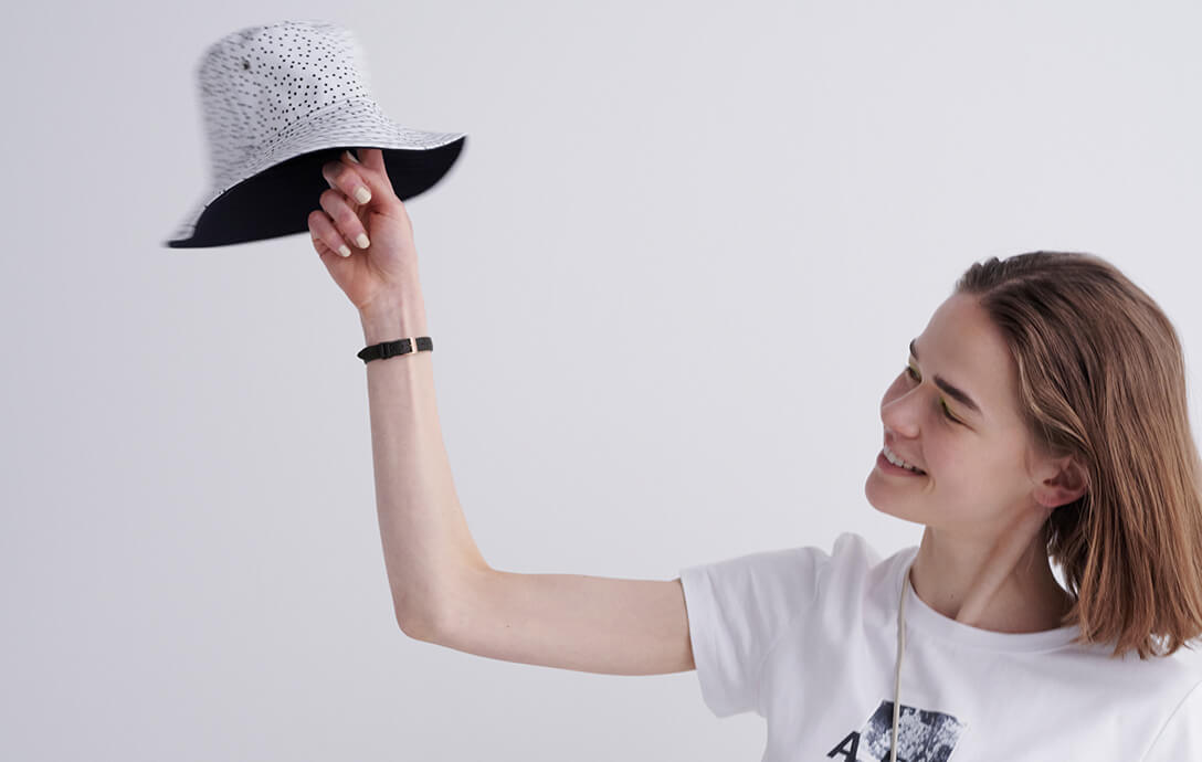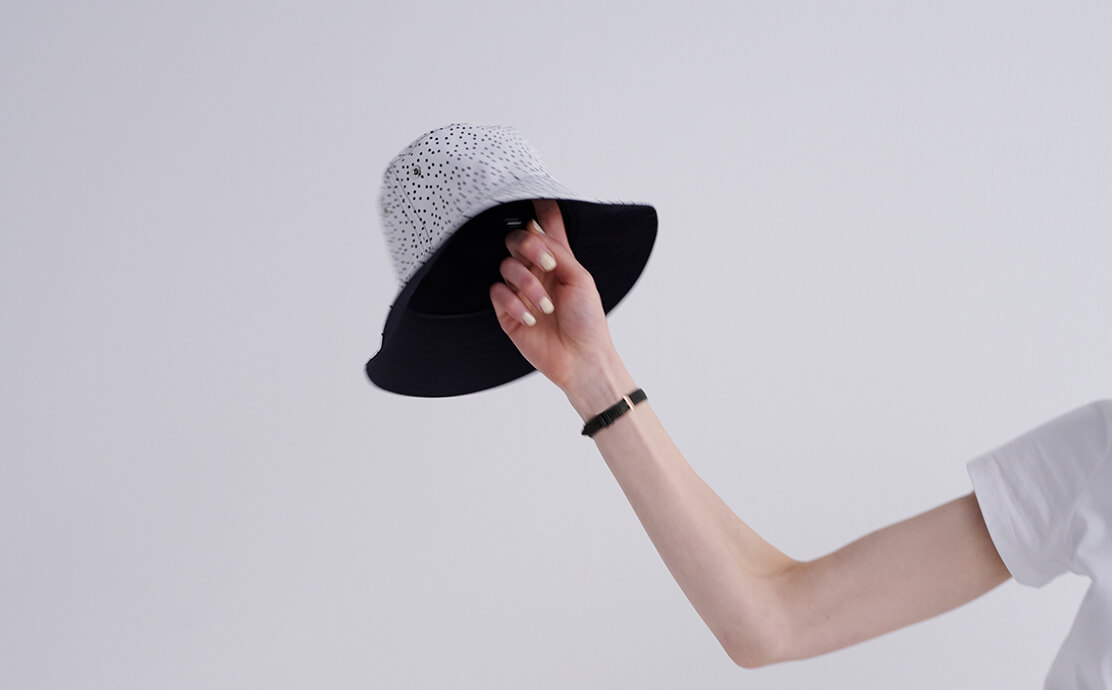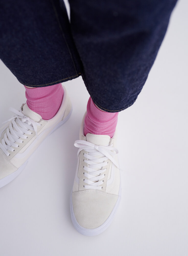 普段はつい赤いソックスを合わせてしまうけど、夏はビビッドなピンクを足もとに効かせたい。ドットハット¥27500/MACKINTOSH(マッキントッシュ 青山店)、ピンクソックス¥2640/MARCOMONDE(マルコモンド渋谷パルコ店)、スニーカー¥7700/VANS(ヴァンズ)、バッグ¥17600/MARROW(シック)、時計¥36,300/マーガレットハウエル(マーガレットハウエル)