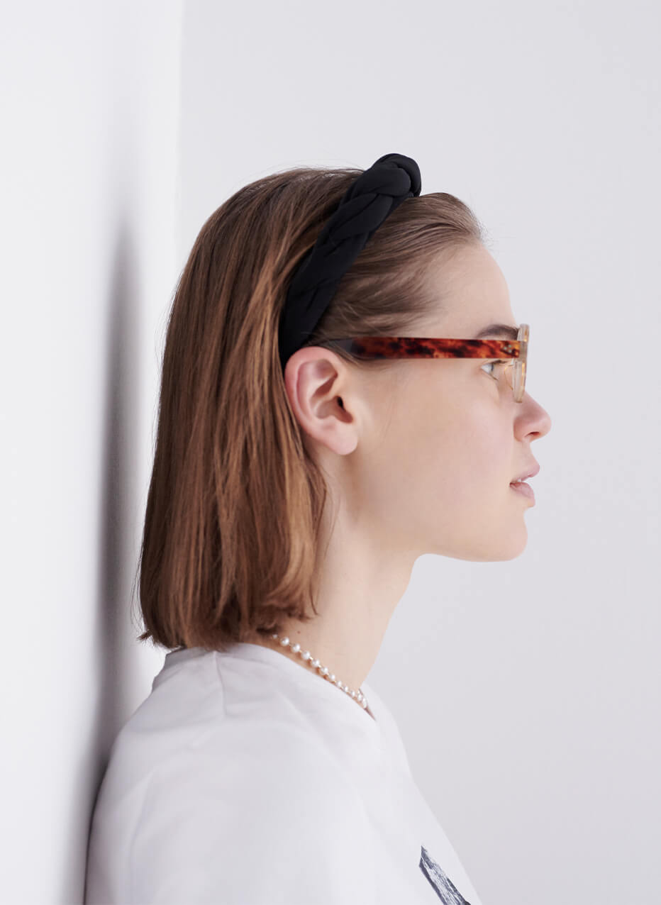 パールとサテン素材のカチューシャを合わせて、気分はまるでパリジェンヌ。カチューシャ¥30800/アレクサンドル ドゥ パリ(アレクサンドル ドゥ パリ GINZA SIX店)、パールネックレス¥26400/MAYU(マユ ショールーム)、眼鏡¥60500/Lesca LUNETIER(グローブスペックス エージェント)サンダル¥26400/BEAUTIFUL SHOES ×HYKE(ボウルズ)