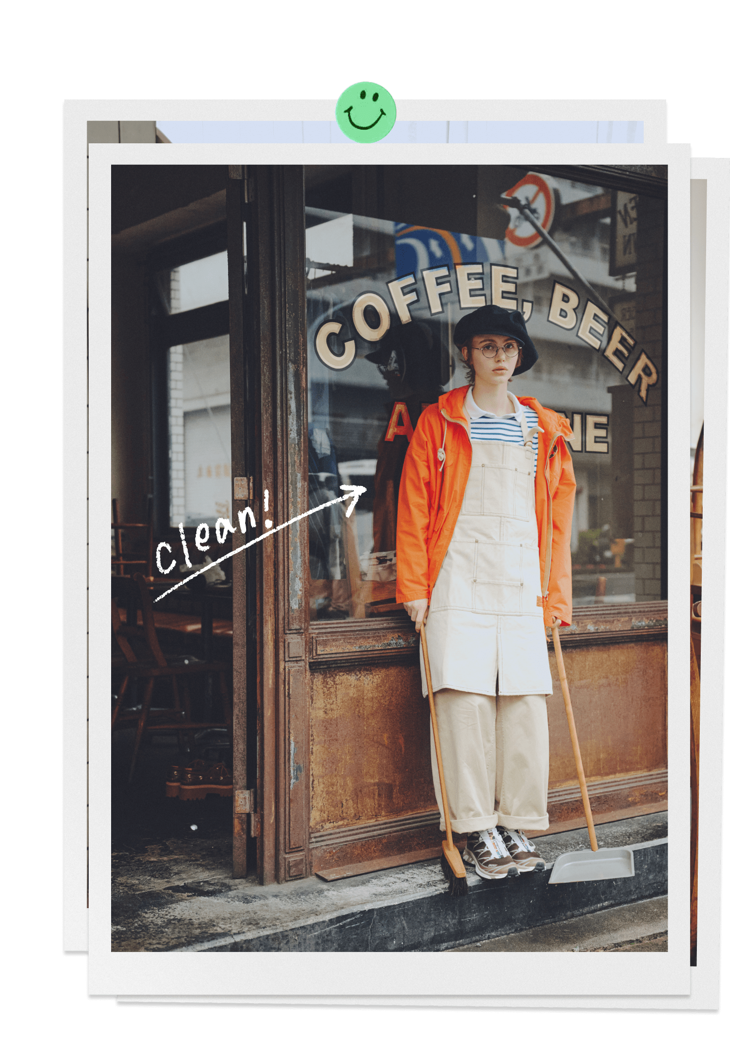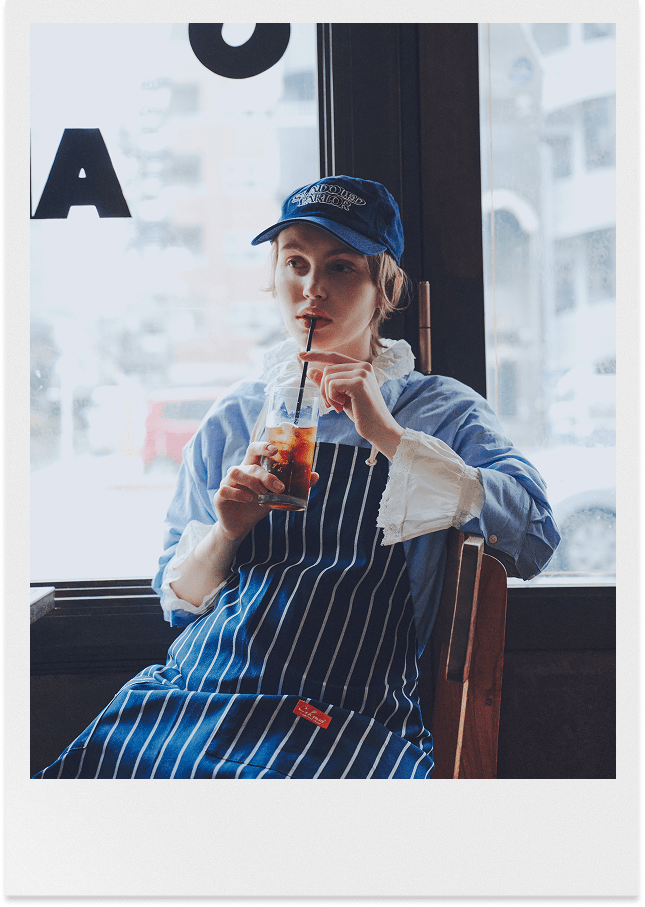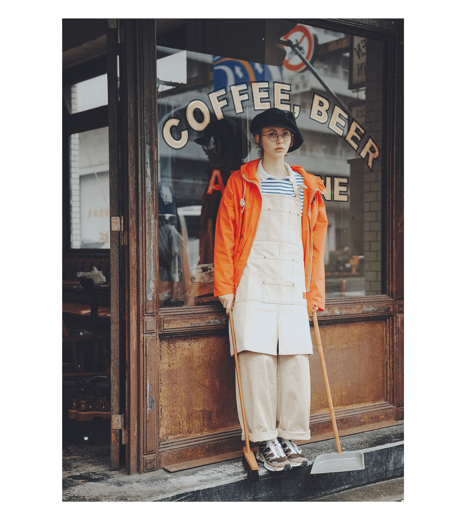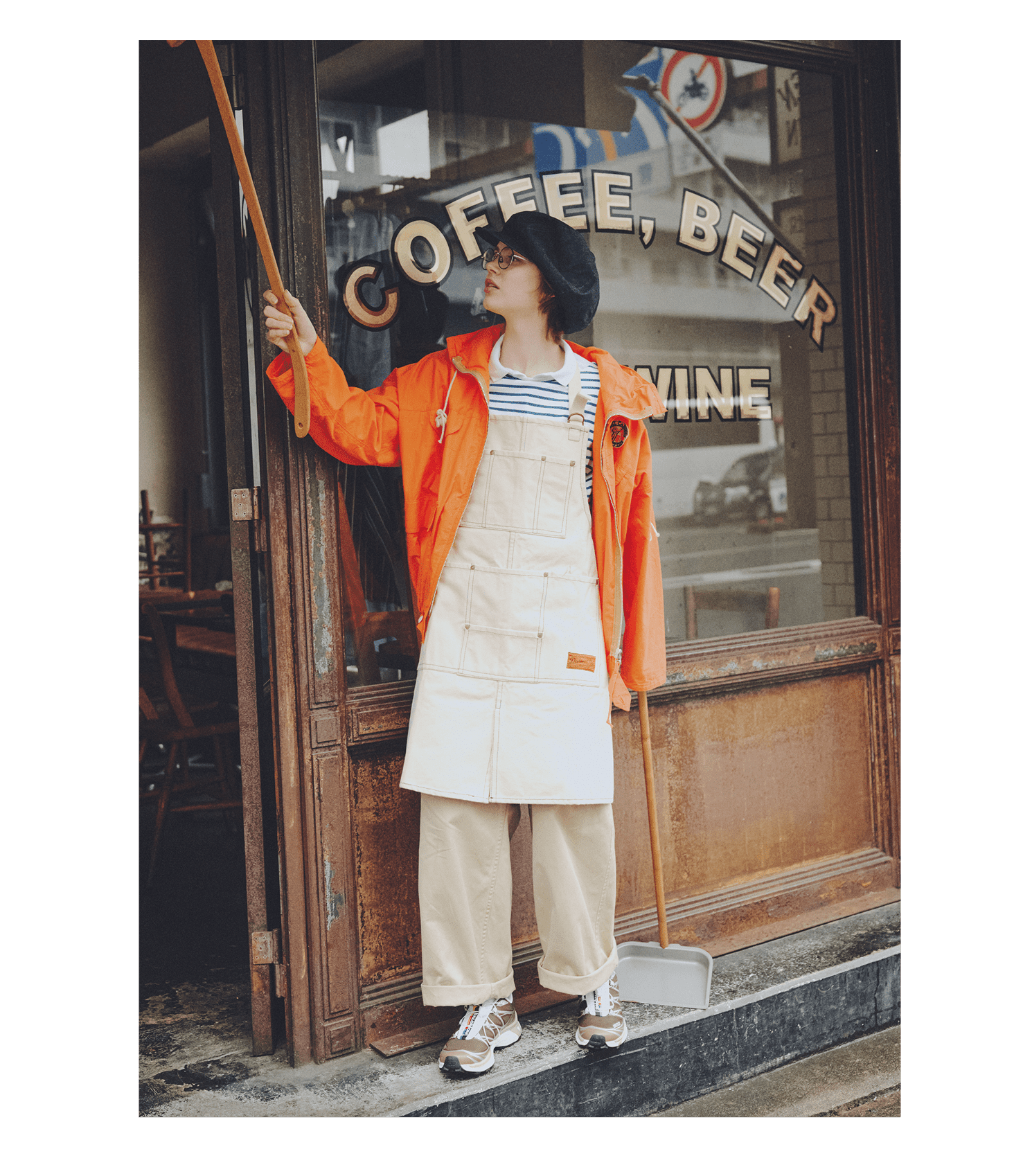 スキマ時間はクリーンタイム。ぱぱっと店内を整えて、気分もすっきり。ワークスタイルの延長で、オーバーオール感覚で取り入れたい《DULTON》のエプロンは、複数ポケットで利便性も◎。アイボリー地に黒ステッチのコントラストが、着こなしにさりげないアクセントを添えてくれる。タフな生地で手に取りやすいプライスなのも、デイリーに使いやすいポイント。今の気分は、しましまトップスやデニムキャスケットを合わせた、ちょっぴりチャーミングな着こなし。エプロンの裾に添えられたオレンジのロゴパッチやフーディとのカラーリンクで、コーディネートに統一感を。