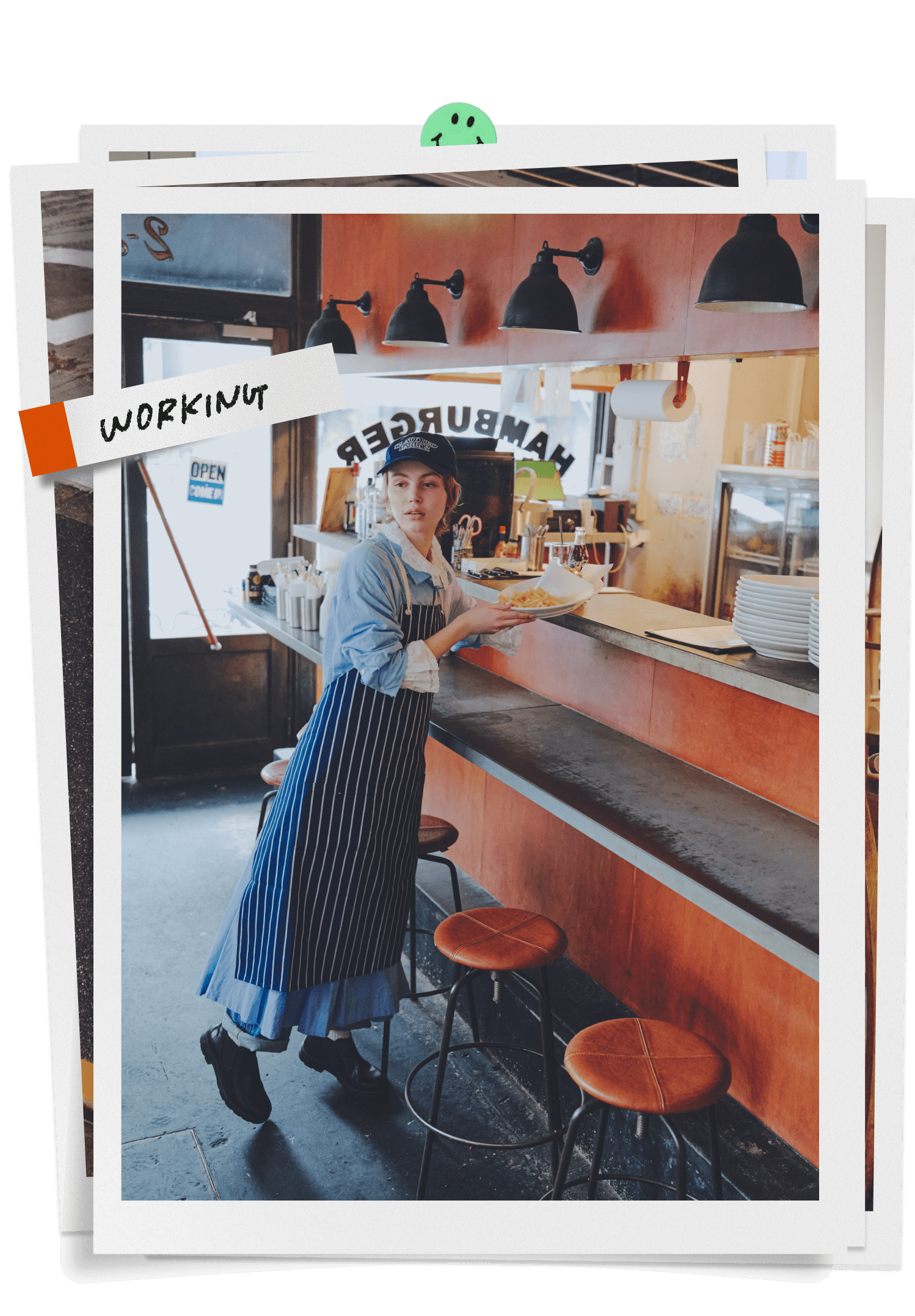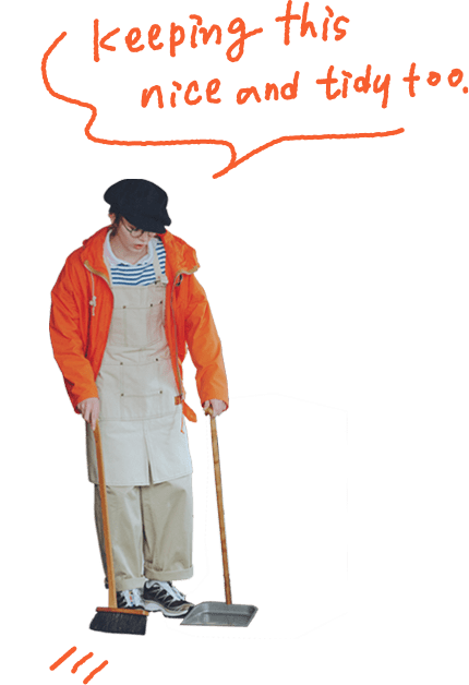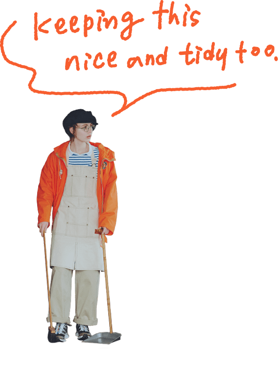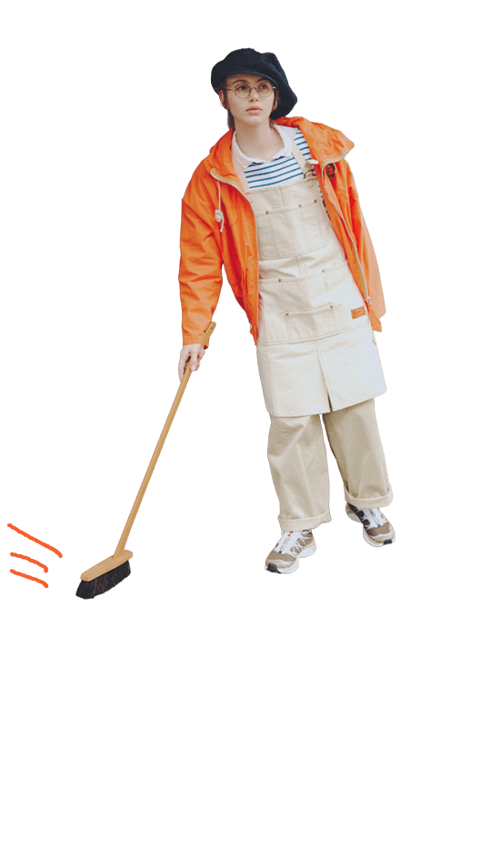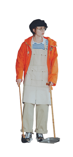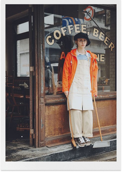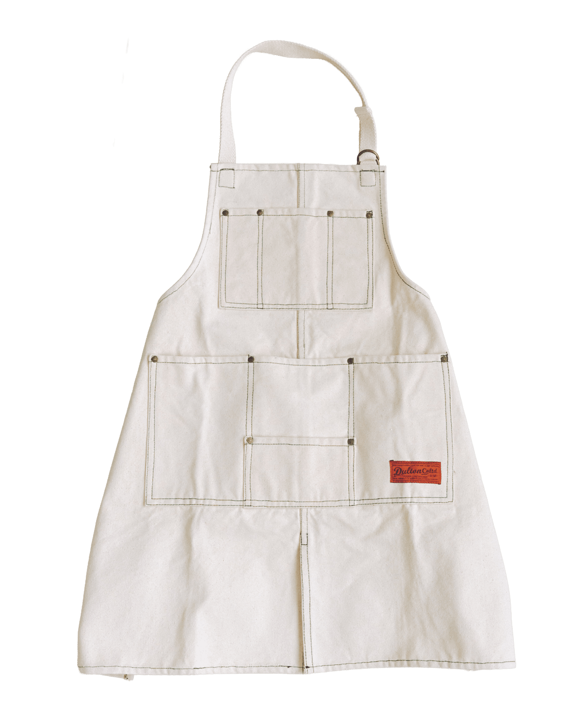 スキマ時間はクリーンタイム。ぱぱっと店内を整えて、気分もすっきり。ワークスタイルの延長で、オーバーオール感覚で取り入れたい《DULTON》のエプロンは、複数ポケットで利便性も◎。アイボリー地に黒ステッチのコントラストが、着こなしにさりげないアクセントを添えてくれる。タフな生地で手に取りやすいプライスなのも、デイリーに使いやすいポイント。今の気分は、しましまトップスやデニムキャスケットを合わせた、ちょっぴりチャーミングな着こなし。エプロンの裾に添えられたオレンジのロゴパッチやフーディとのカラーリンクで、コーディネートに統一感を。