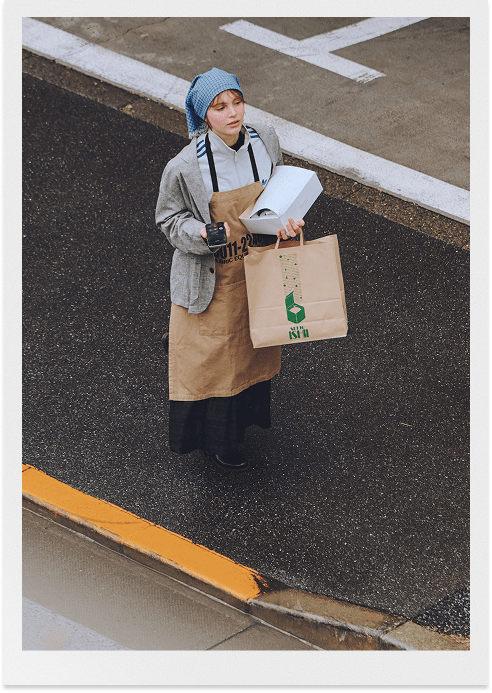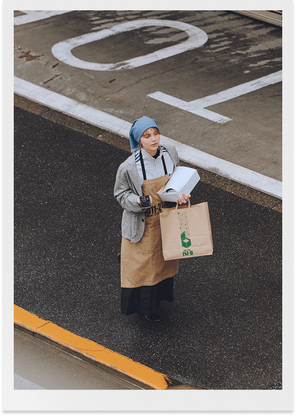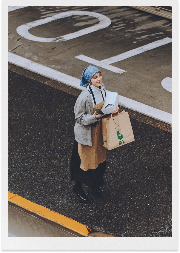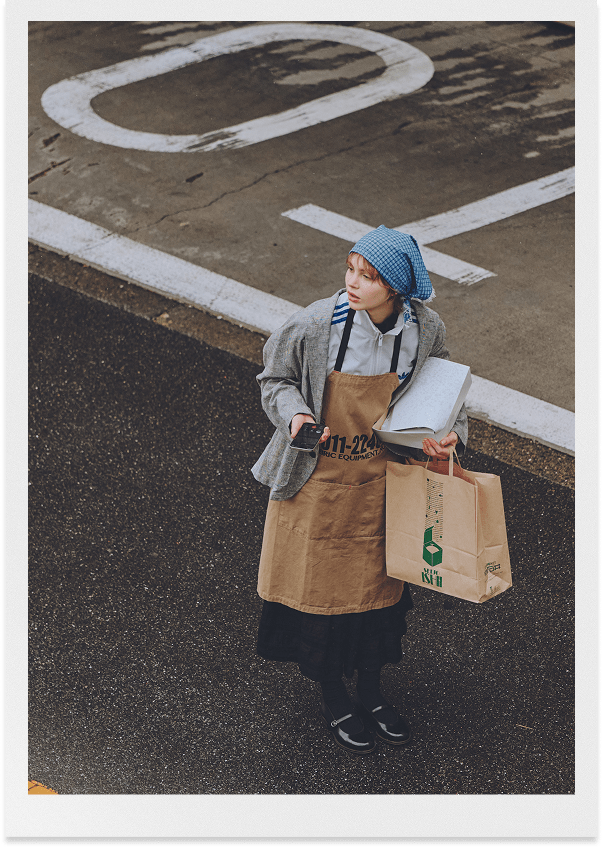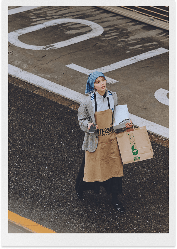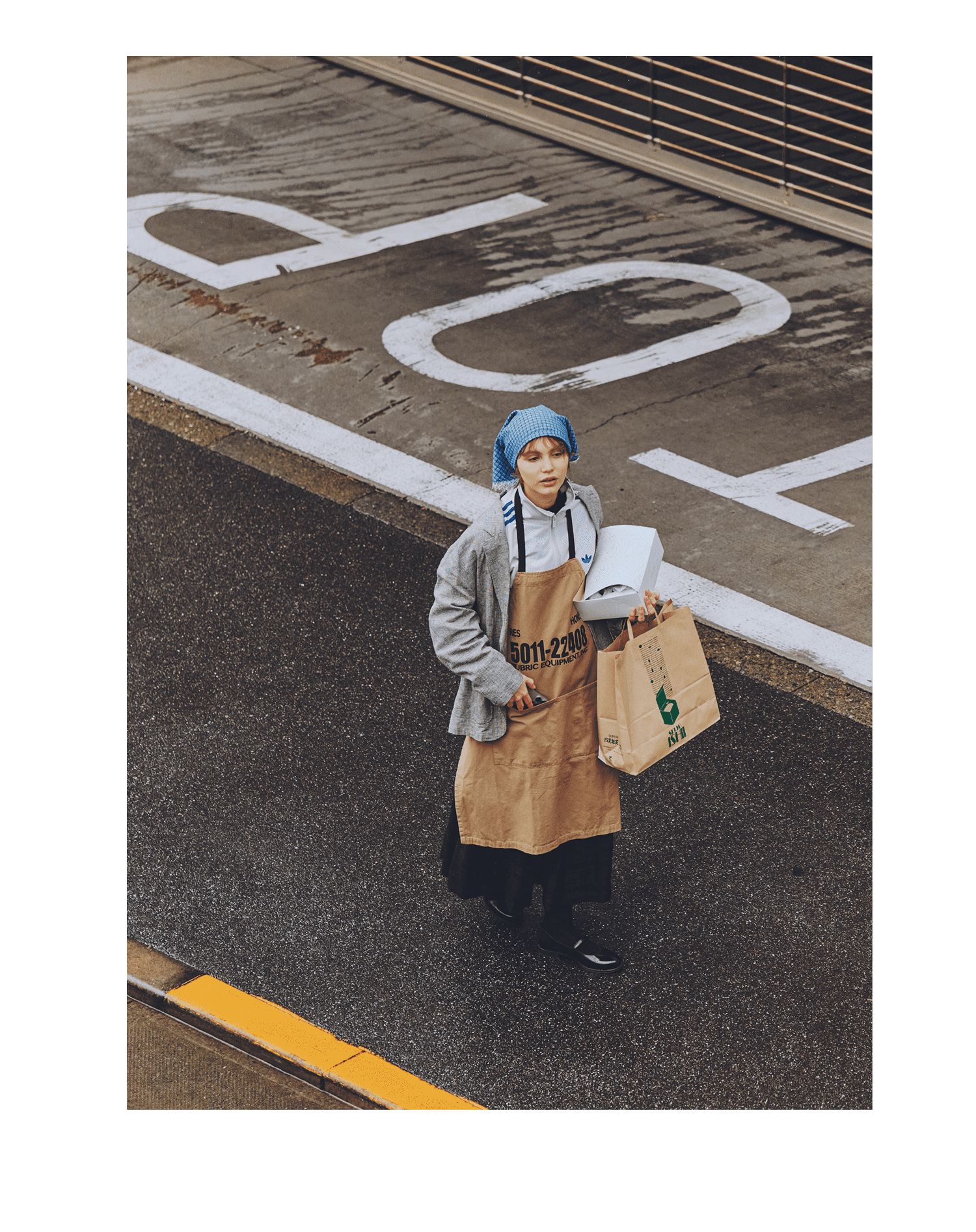お昼時はデリバリーの依頼も多め。今日も軽快な足どりで出発。この日の主役は、《VOIRY》のどこかインダストリアルな空気をまとった渋めベージュのエプロン。存在感のあるロゴで遊びを効かせて、スタイリングのアクセントに。羽織るだけでよそ行き感を出せるテーラードジャケットの下には、動きやすさと洒落感を兼ね備えたトラックジャケットをレイヤード。肩を少し抜いてラフに着ることで、スポーティなロゴも自然に馴染ませて。足元はレザーシューズでトラッドなムードをひとさじ。スポーツもワークもトラッドも、ミックスして着るバランスがしっくりくる。