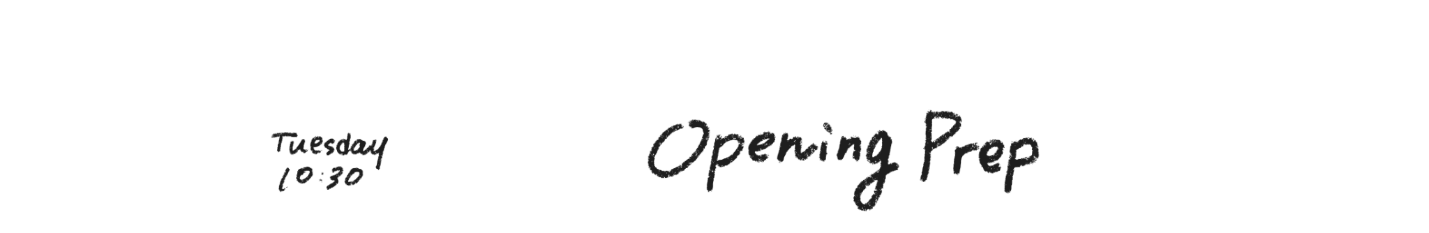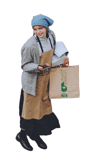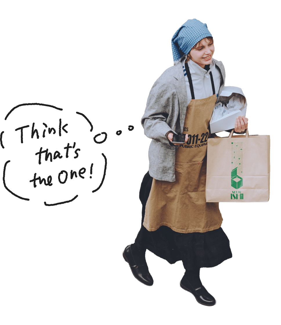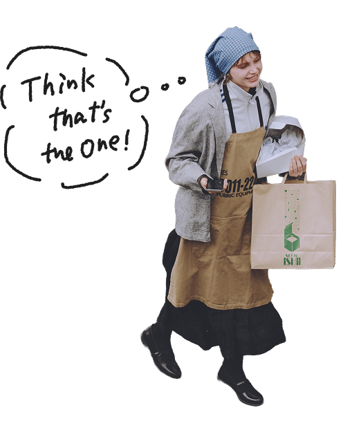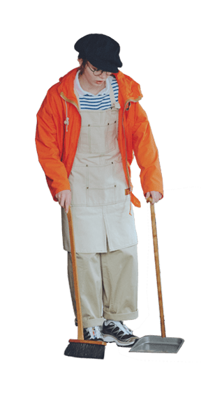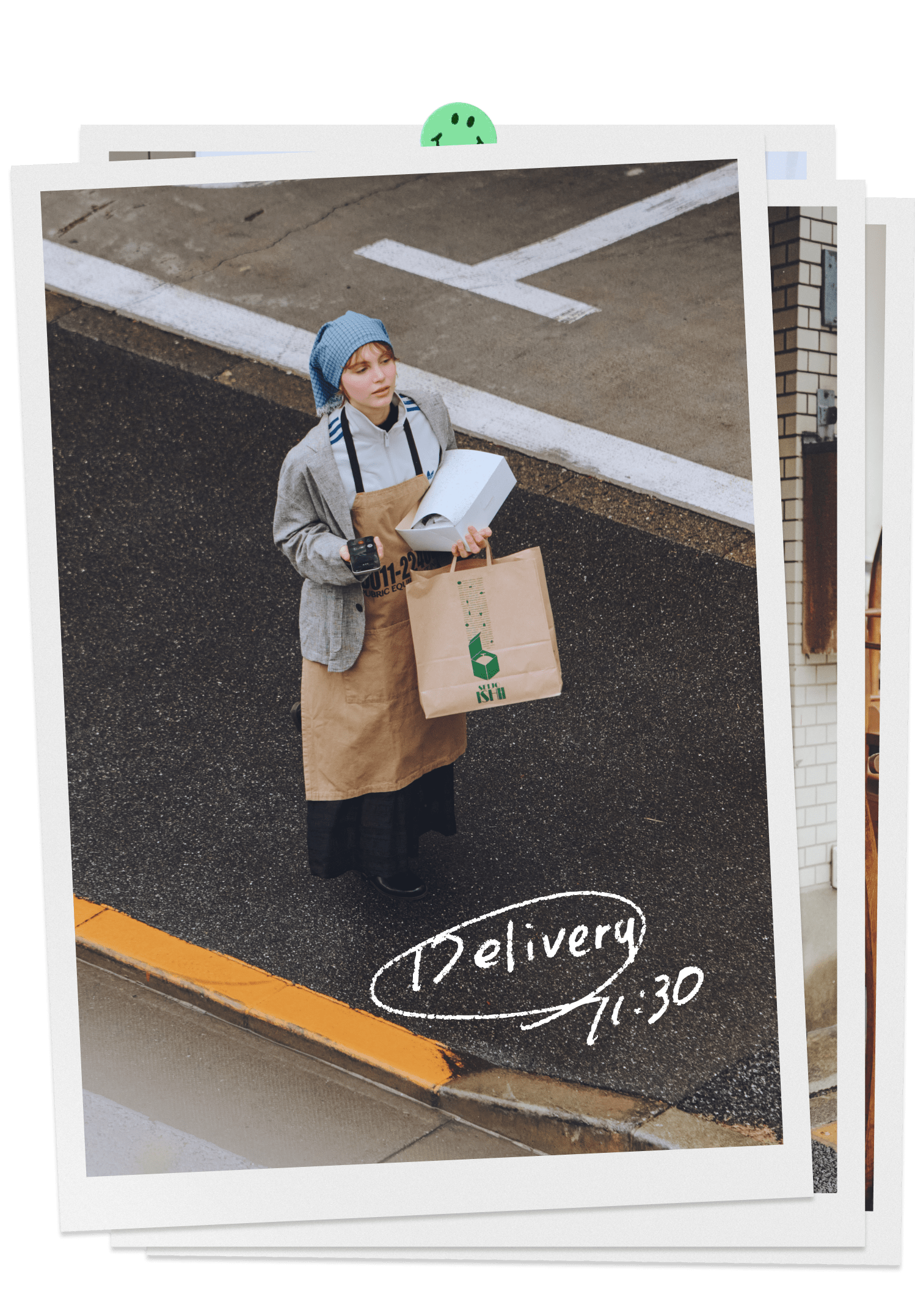 お昼時はデリバリーの依頼も多め。今日も軽快な足どりで出発。この日の主役は、《VOIRY》のどこかインダストリアルな空気をまとった渋めベージュのエプロン。存在感のあるロゴで遊びを効かせて、スタイリングのアクセントに。羽織るだけでよそ行き感を出せるテーラードジャケットの下には、動きやすさと洒落感を兼ね備えたトラックジャケットをレイヤード。肩を少し抜いてラフに着ることで、スポーティなロゴも自然に馴染ませて。足元はレザーシューズでトラッドなムードをひとさじ。スポーツもワークもトラッドも、ミックスして着るバランスがしっくりくる。