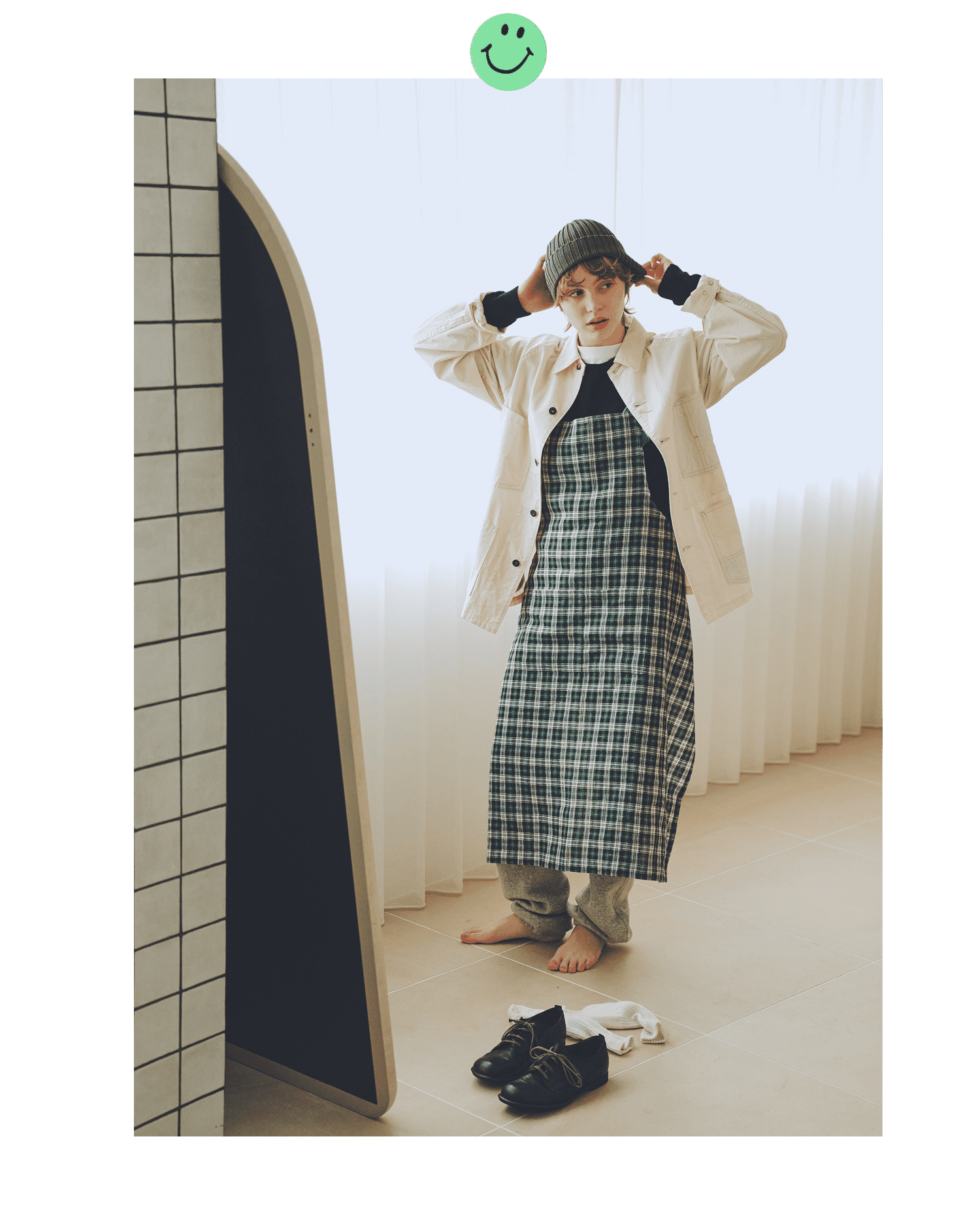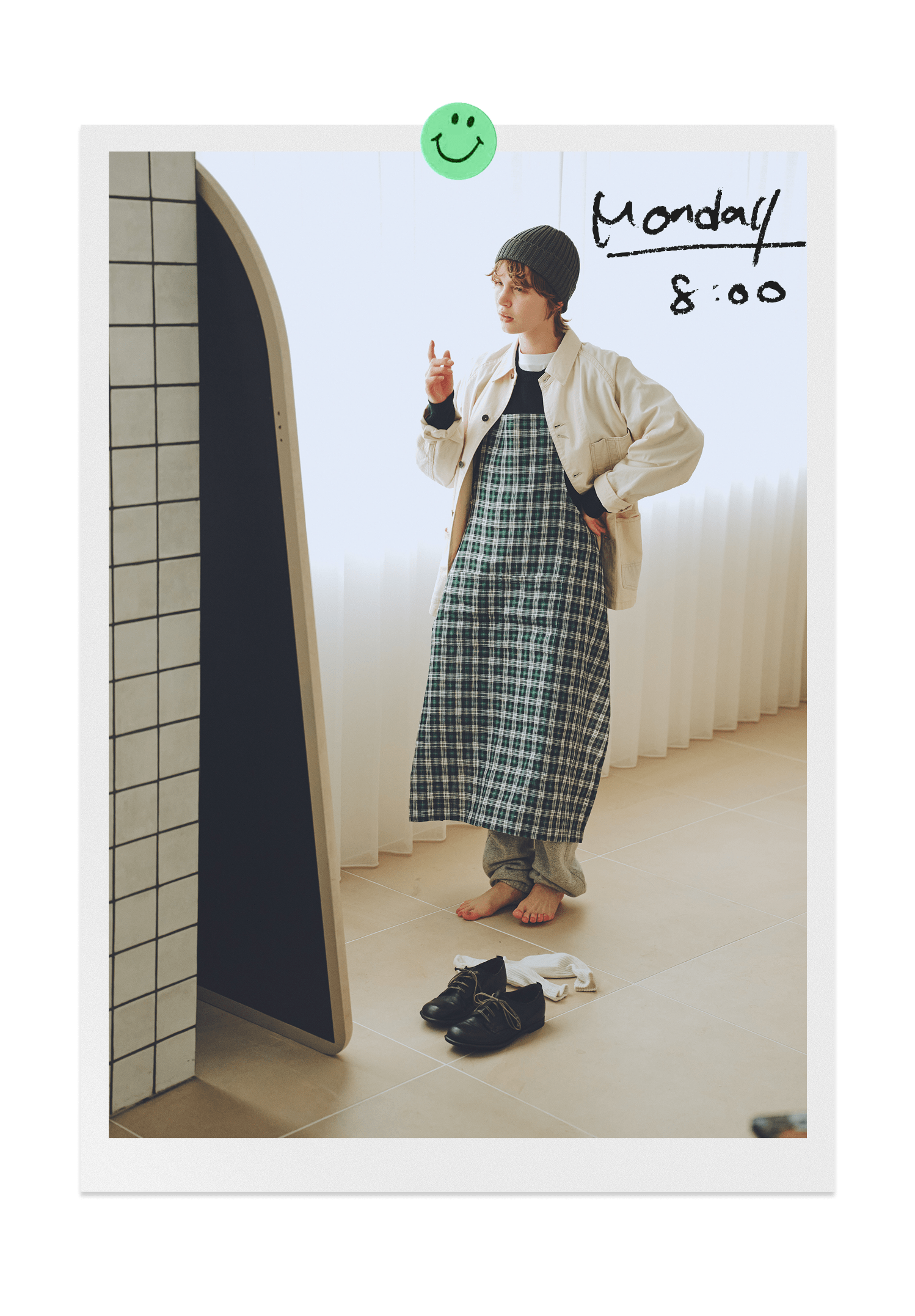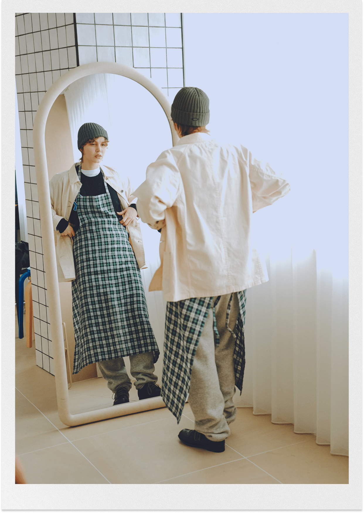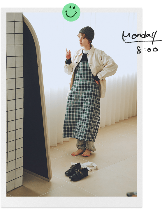 出勤前の朝の身支度。Gabiのコーディネートは、エプロン選びから始まります。週始めの月曜日は、シンプルな着こなしにひと重ねで差がつく《fog linen work》のチェック柄のエプロンを主役に。ラフな着こなしを叶える長めの丈感もポイント。潔くシンプル&ベーシックにまとめるのも素敵だけれど、チェック柄を取り入れるだけで一気にトラッドなムードが加わって、ぐっと雰囲気のあるスタイリングに。ジャケットを脱いでも様になる着こなしだから、朝夕で寒暖差のある今の時期も気兼ねなく温度調整ができる。そんなところもお洒落さんならではのこだわり。スタイリングが決まったら、行ってきます。