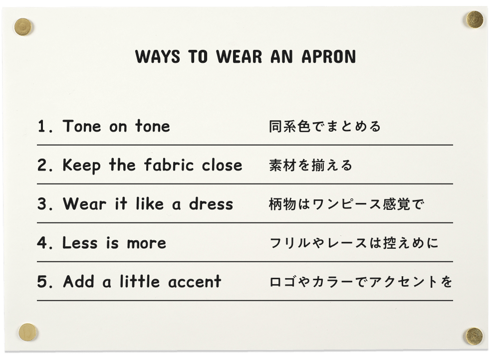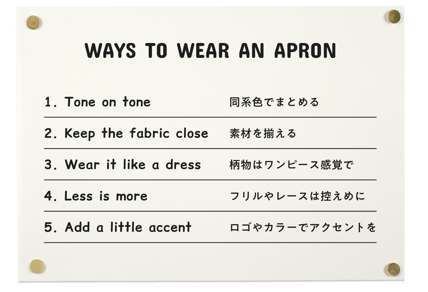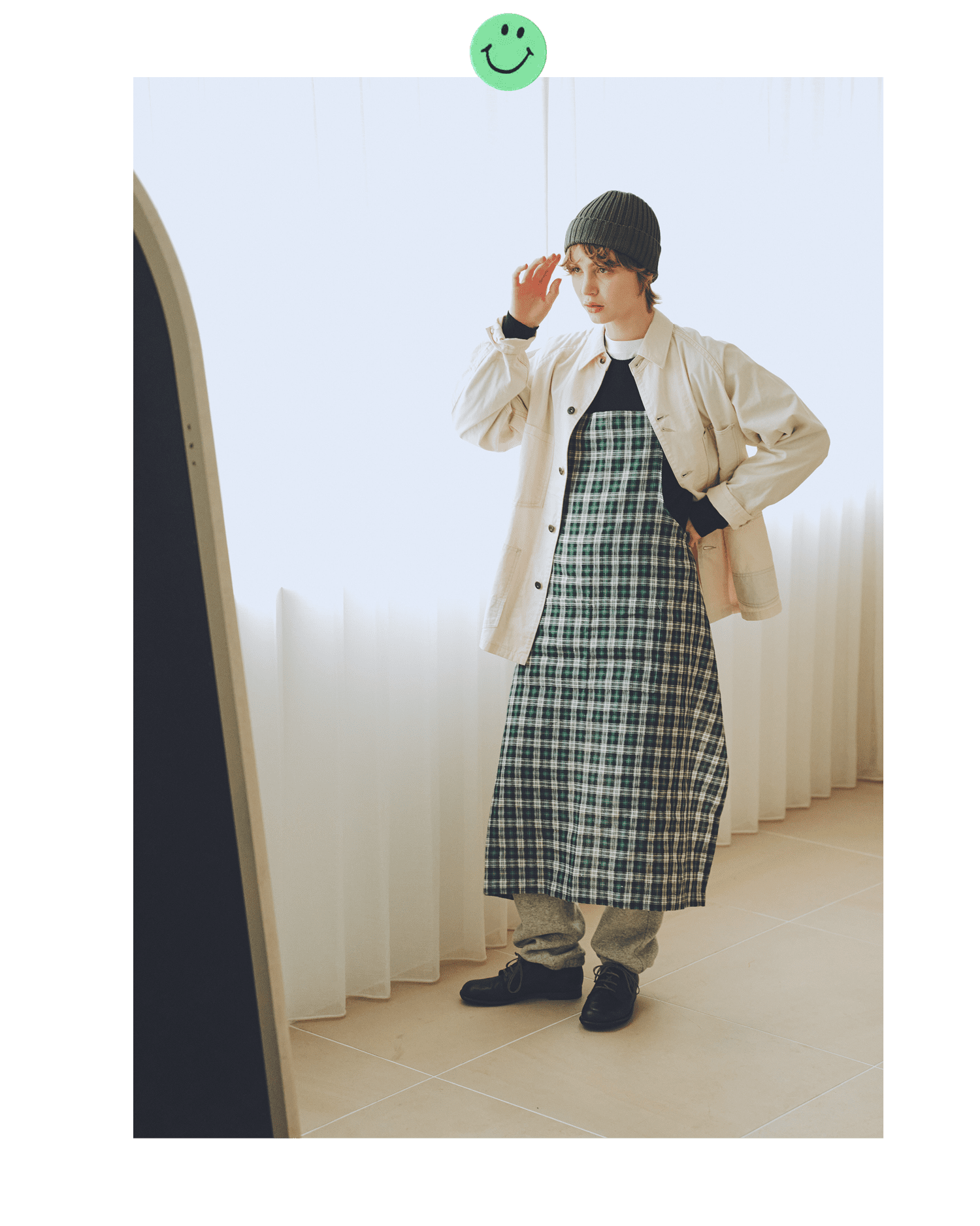 出勤前の朝の身支度。Gabiのコーディネートは、エプロン選びから始まります。週始めの月曜日は、シンプルな着こなしにひと重ねで差がつく《fog linen work》のチェック柄のエプロンを主役に。ラフな着こなしを叶える長めの丈感もポイント。潔くシンプル&ベーシックにまとめるのも素敵だけれど、チェック柄を取り入れるだけで一気にトラッドなムードが加わって、ぐっと雰囲気のあるスタイリングに。ジャケットを脱いでも様になる着こなしだから、朝夕で寒暖差のある今の時期も気兼ねなく温度調整ができる。そんなところもお洒落さんならではのこだわり。スタイリングが決まったら、行ってきます。
