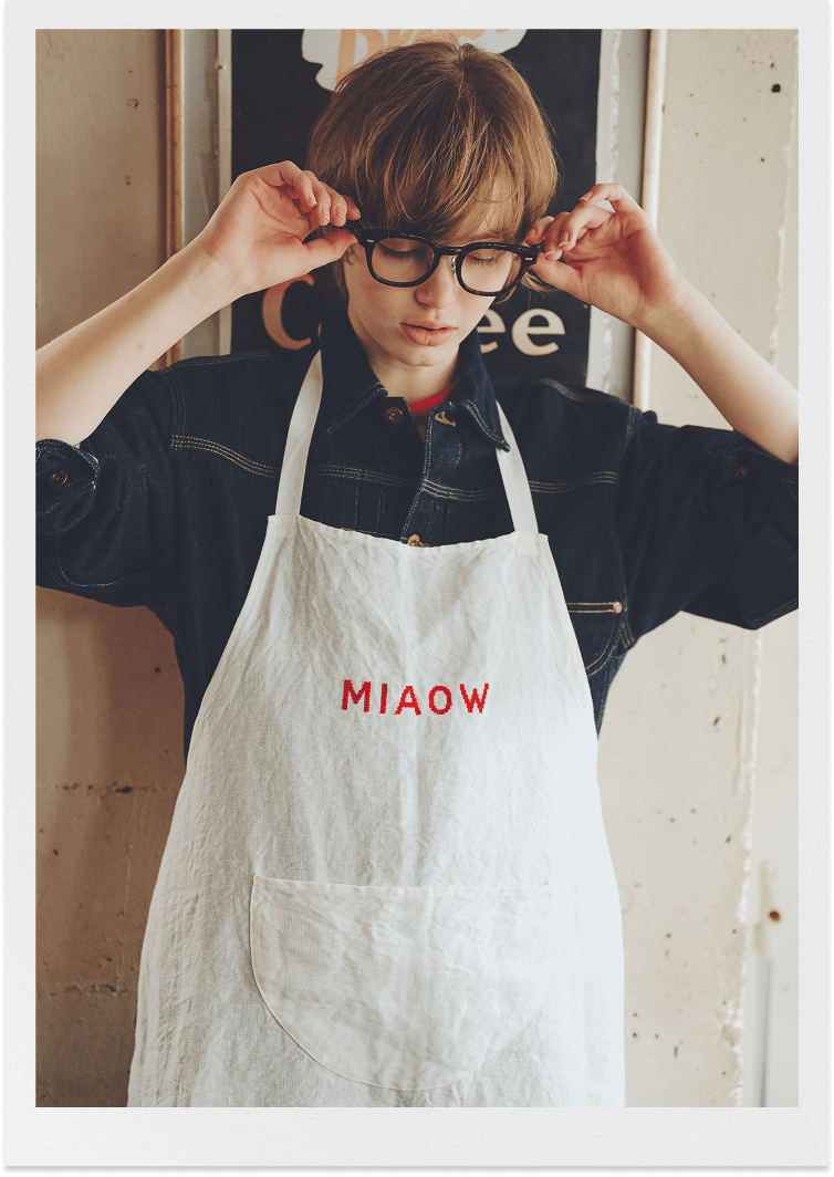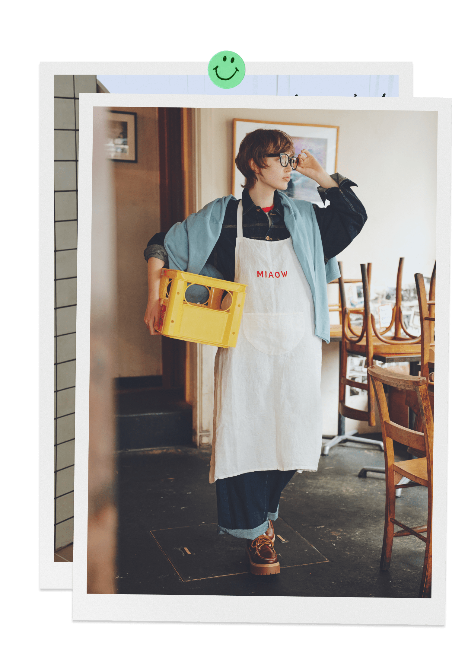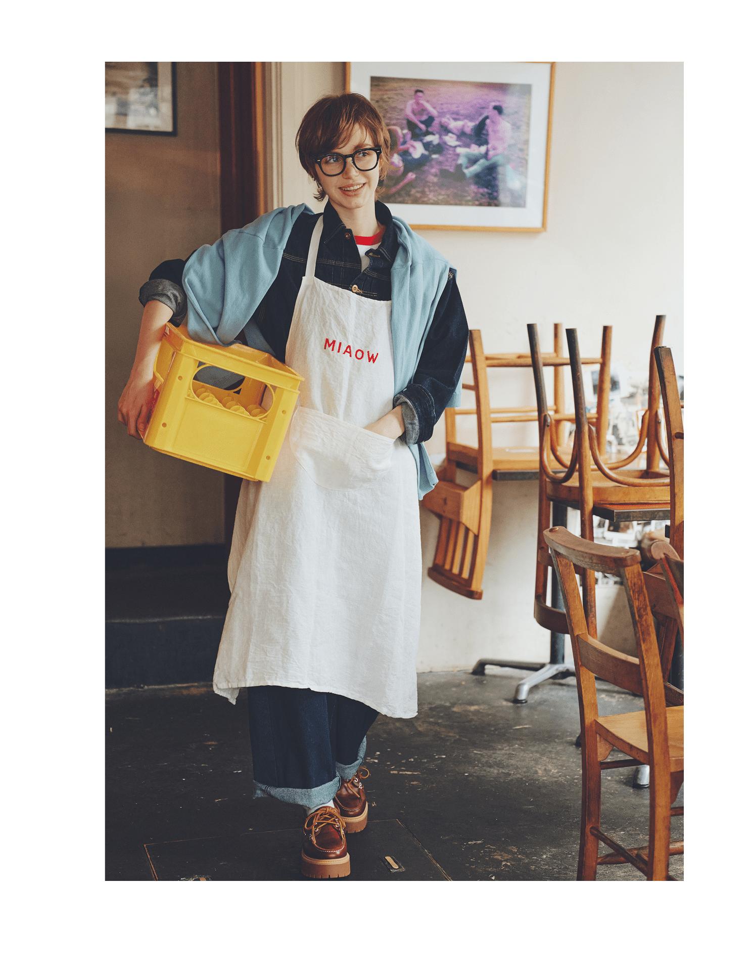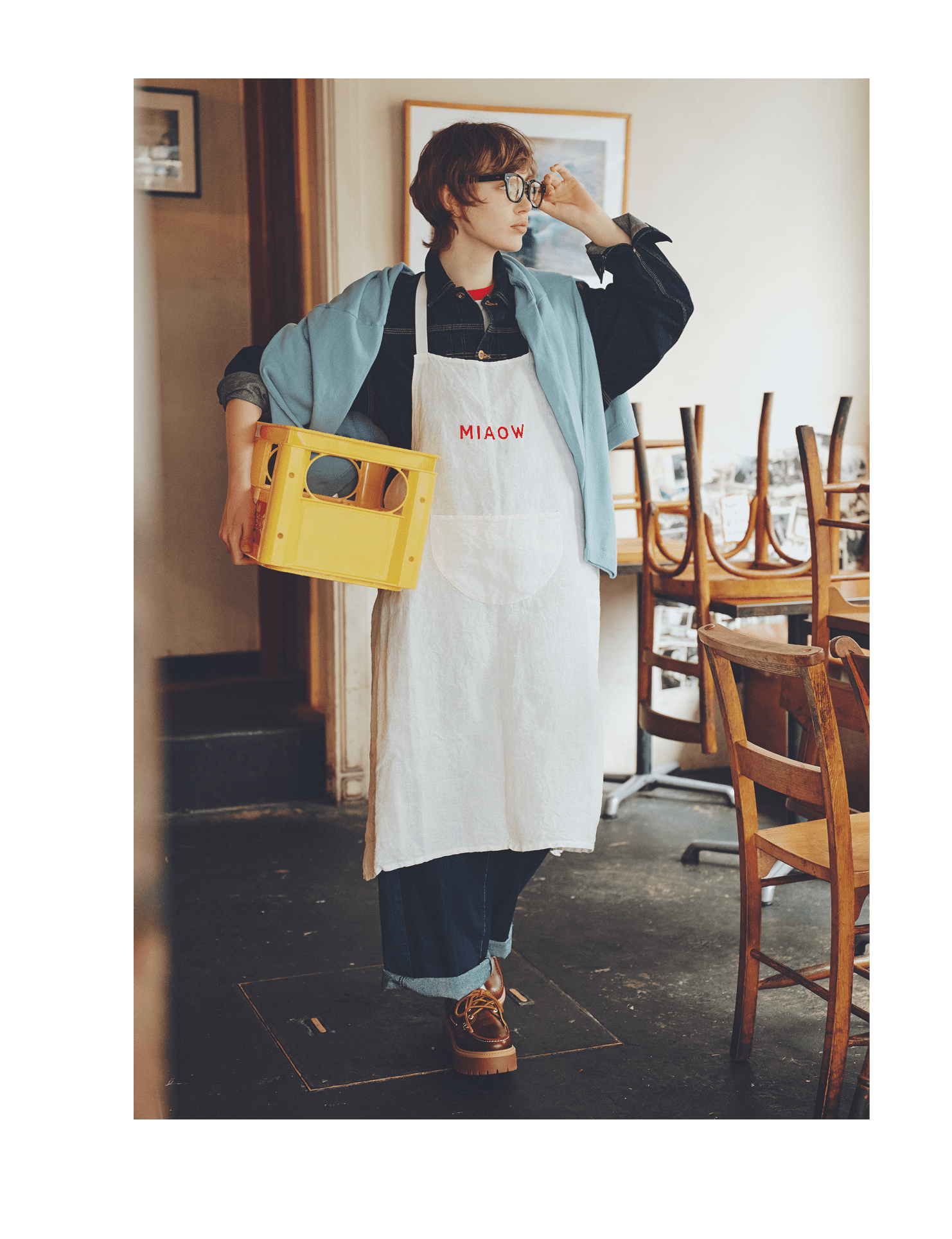 テキパキと開店準備中。この日は、猫の鳴き声“MIAOW”の刺繍がポイントの《R&D.M.Co-》の白いリネンエプロンを主役にスタイリング。ロゴ刺繍だけでなく、お腹のあたりに配された半円型のポケットもさりげなく可愛い。「このブランドは毎シーズン可愛いエプロンが登場するから、よくチェックするの」とGabi。エプロンの下は、インディゴのデニムジャケットとデニムパンツを合わせて、セットアップ風にコーディネート。デニムジャケットの襟元から、MIAOWの刺繍と同じ赤色のリンガーネックを覗かせたのもこだわり。朝晩はまだ少し肌寒い季節、水色のニットを肩掛けして出勤。レイヤードも春のお洒落の醍醐味。