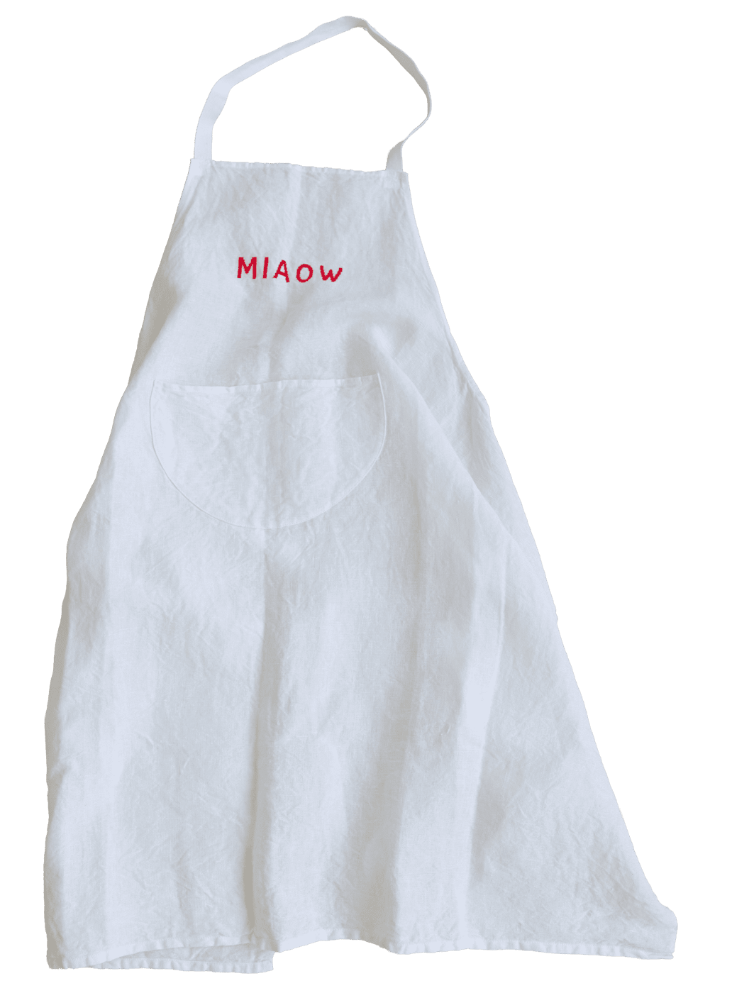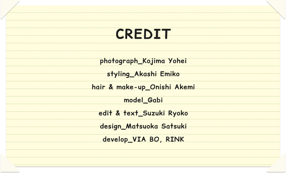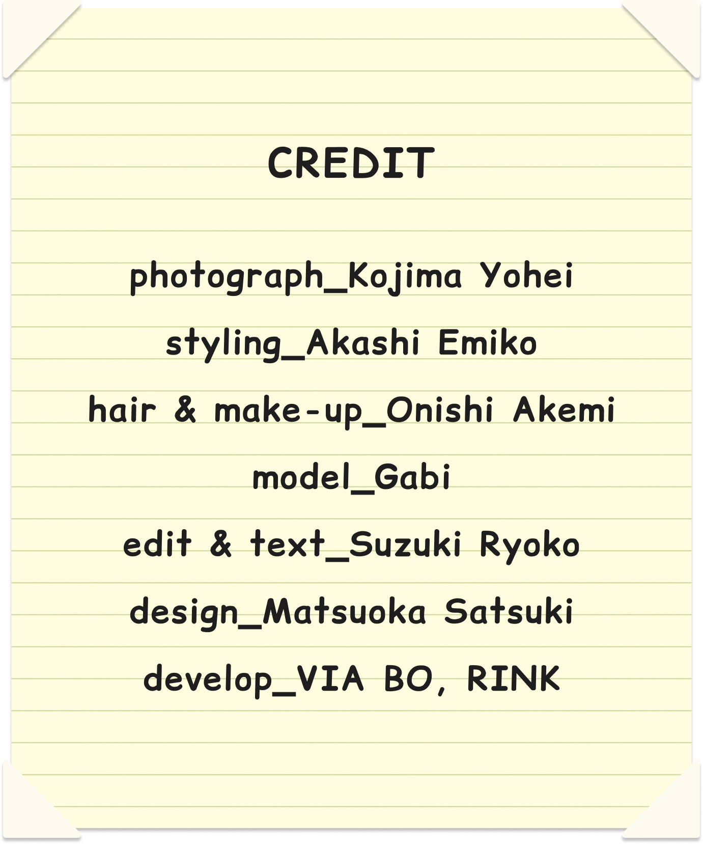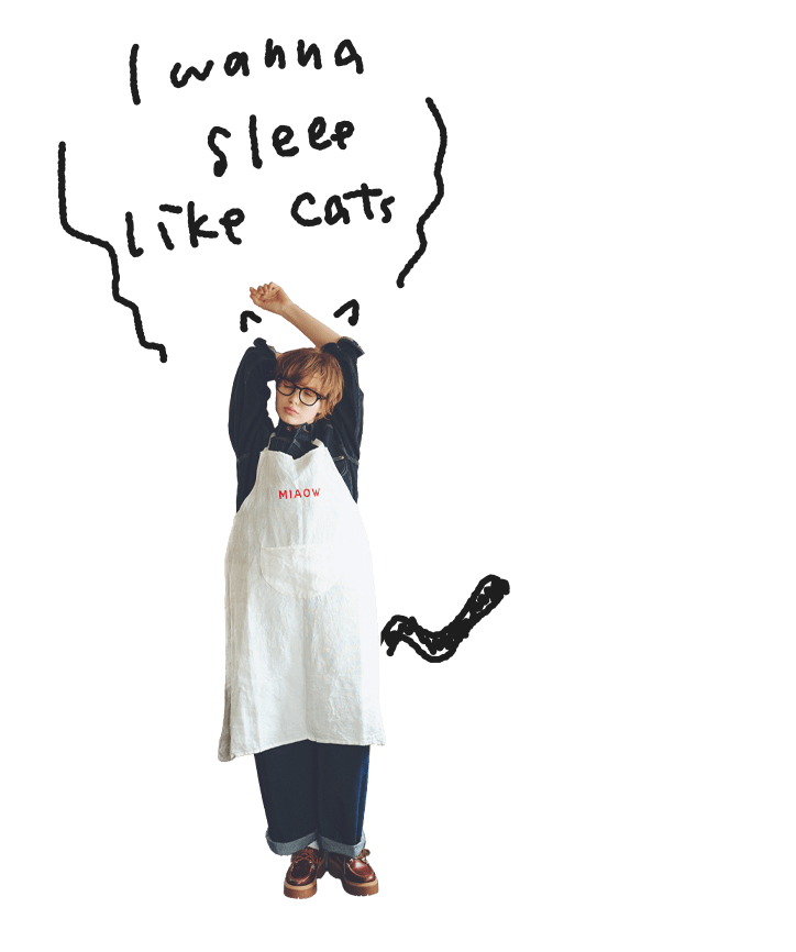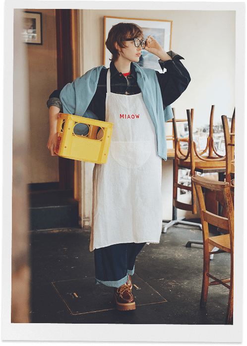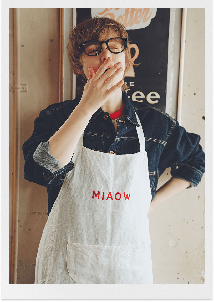 テキパキと開店準備中。この日は、猫の鳴き声“MIAOW”の刺繍がポイントの《R&D.M.Co-》の白いリネンエプロンを主役にスタイリング。ロゴ刺繍だけでなく、お腹のあたりに配された半円型のポケットもさりげなく可愛い。「このブランドは毎シーズン可愛いエプロンが登場するから、よくチェックするの」とGabi。エプロンの下は、インディゴのデニムジャケットとデニムパンツを合わせて、セットアップ風にコーディネート。デニムジャケットの襟元から、MIAOWの刺繍と同じ赤色のリンガーネックを覗かせたのもこだわり。朝晩はまだ少し肌寒い季節、水色のニットを肩掛けして出勤。レイヤードも春のお洒落の醍醐味。