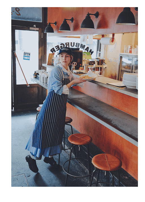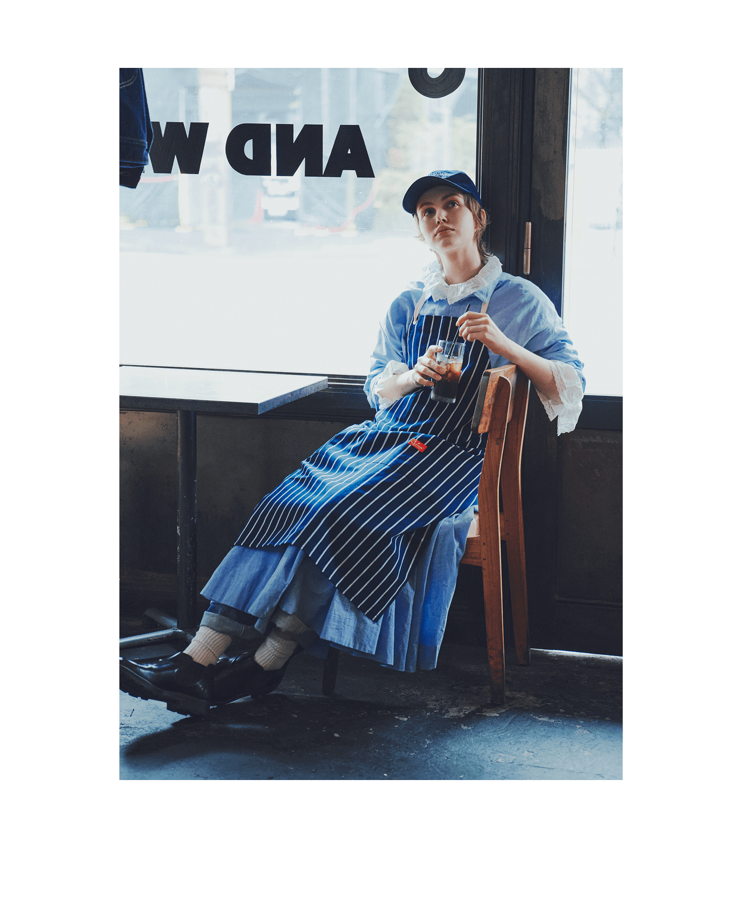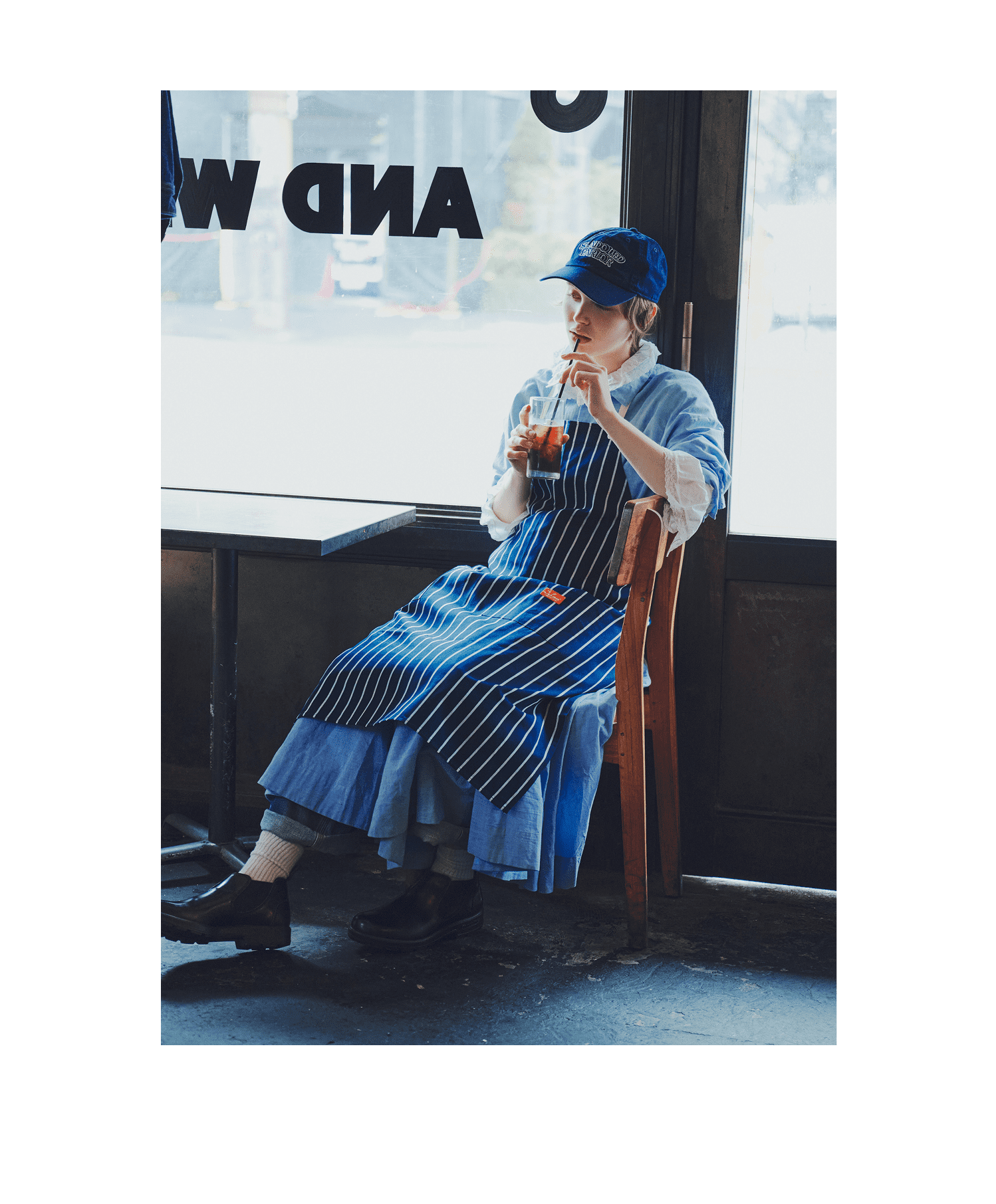 「いらっしゃいませ!」「お待たせしました!」今日も賑わう私たちのバーガーショップ。スタッフとして働いて3年、ランチタイムはバタバタだけど、「今日の着こなしもいいね」と常連さんに声をかけられてご機嫌。《Cookman》のネイビー×ホワイトのストライプエプロンは、Tシャツ×デニムのシンプルカジュアルにはもちろん、今日みたいなワンピーススタイルにもよく似合う。ライトブルーのロングワンピースの襟元や袖口から、白いブラウスのレースを覗かせて、ほんのりロマンティックに。甘い着こなしには、キャップやワークブーツで少しだけハズしを効かせるのが気分。最後にエプロンで全体を引き締めて、ちょっぴりハンサムなガーリースタイルに。