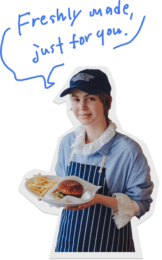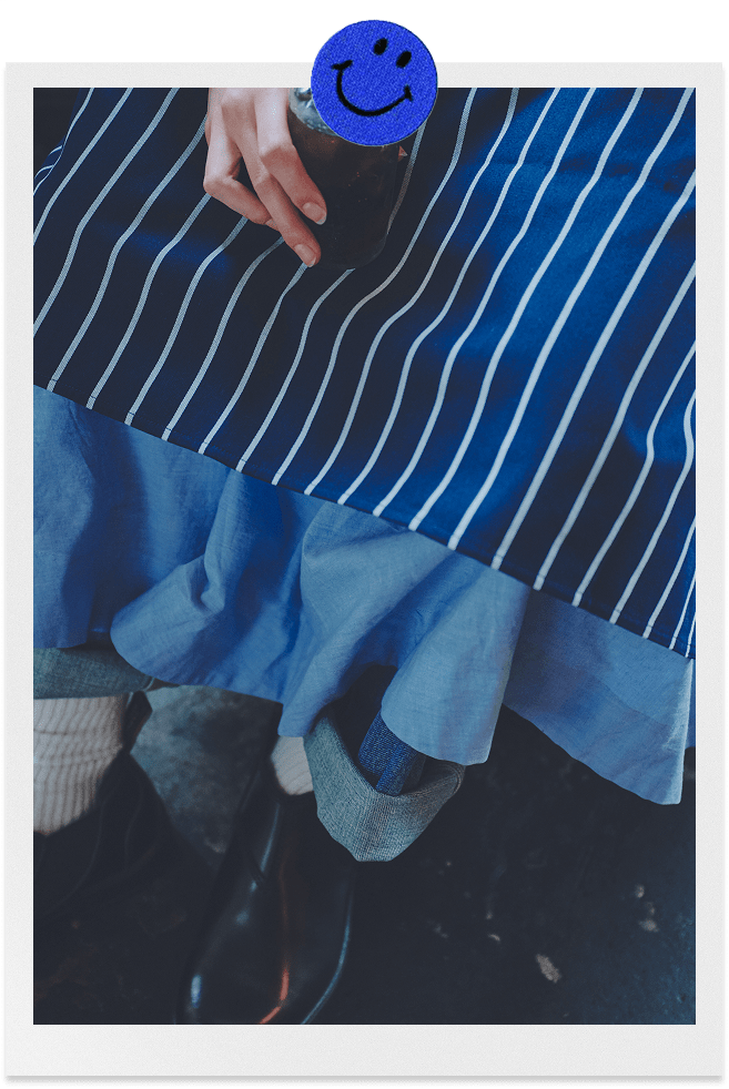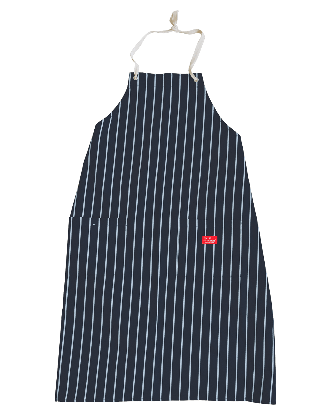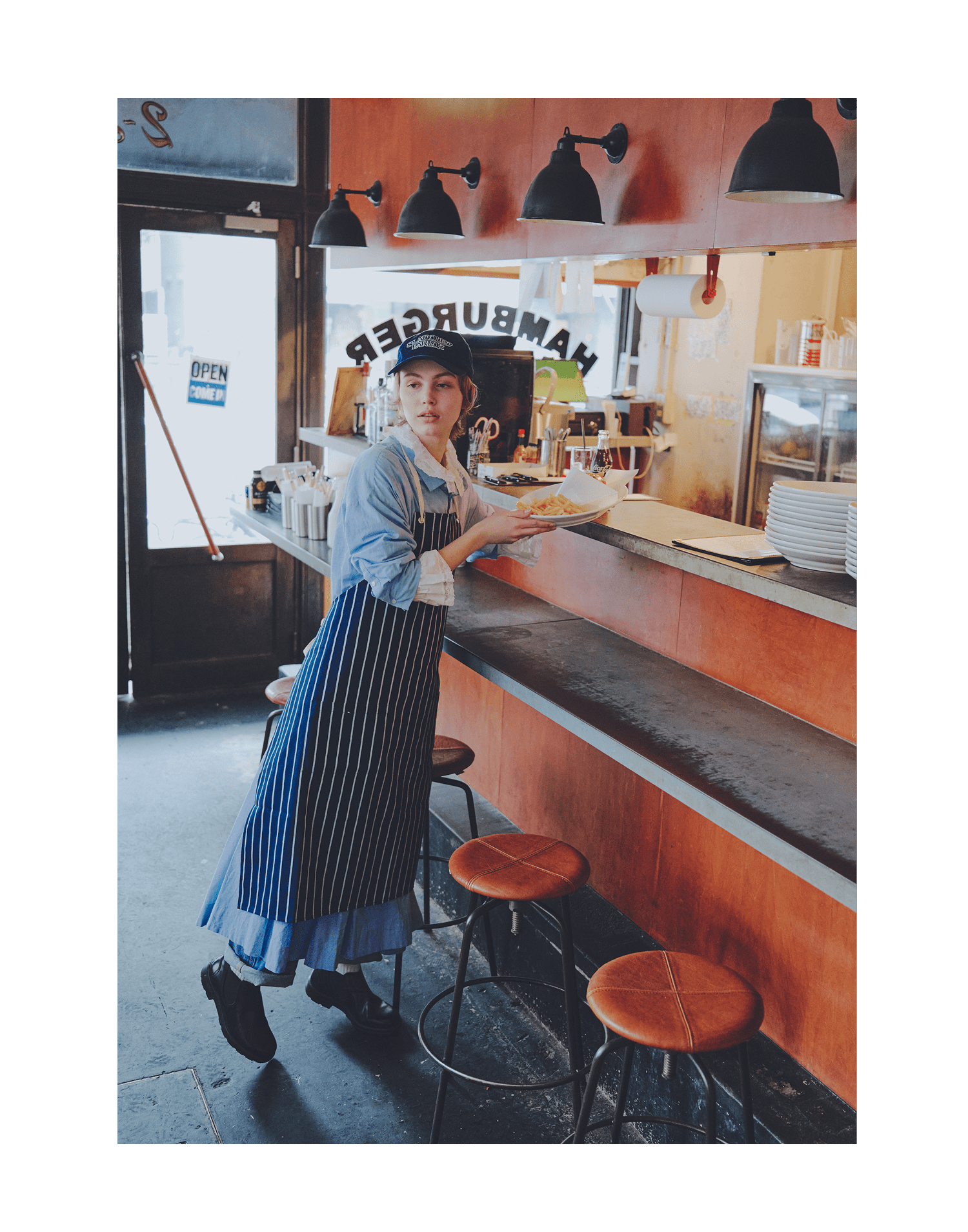 「いらっしゃいませ!」「お待たせしました!」今日も賑わう私たちのバーガーショップ。スタッフとして働いて3年、ランチタイムはバタバタだけど、「今日の着こなしもいいね」と常連さんに声をかけられてご機嫌。《Cookman》のネイビー×ホワイトのストライプエプロンは、Tシャツ×デニムのシンプルカジュアルにはもちろん、今日みたいなワンピーススタイルにもよく似合う。ライトブルーのロングワンピースの襟元や袖口から、白いブラウスのレースを覗かせて、ほんのりロマンティックに。甘い着こなしには、キャップやワークブーツで少しだけハズしを効かせるのが気分。最後にエプロンで全体を引き締めて、ちょっぴりハンサムなガーリースタイルに。