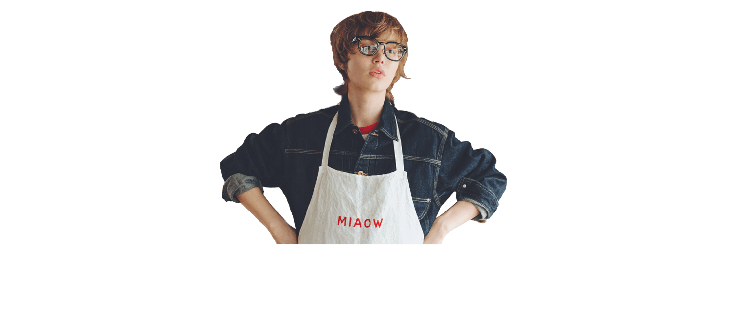エプロン¥16280 / R&D.M.Co- (ザ・ディアグラウンド)、デニムジャケット¥20900 / Lee × FREAK’S STORE、デニムパンツ¥17160 / FREAK’S STORE (ともにフリークス ストア渋谷)、Tシャツ¥14300 / HOLLYWOOD RANCH MARKET (ハリウッド ランチ マーケット)、肩にかけたカーディガン¥38,500 / BLUE BLUE JAPAN(オクラ)、メガネ¥19800 / THE BEDFORD HOTEL (キングスター)、シューズ¥25300 / Timberland (VF ジャパン)、ソックス / スタイリスト私物