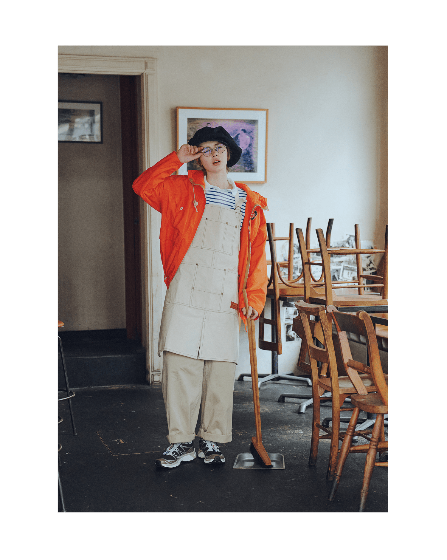 エプロン¥3520 / DULTON(ダルトン)、ジャケット¥83600、ボーダーTシャツ¥27500/ともにNigel Cabourn WOMAN(アウターリミッツ)、ポロシャツ¥15400 / HOLLYWOOD RANCH MARKET(ハリウッド ランチ マーケット)、パンツ¥35200/Véritécoeur(ヴェリテクール)、メガネ¥23100/THE BEDFORD HOTEL(キングスター)、デニムキャスケット¥14300 / BLUE BLUE(ハリウッド ランチ マーケット)、スニーカー¥28600/Salomon × FREAK’S STORE(フリークス ストア渋谷)