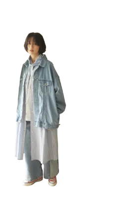デニムは昔から好きだという臼田さん。最近はジャストサイズよりも大きめのサイズを選んで、腰回りにゆとりを持たせるのが気分なのだとか。思い切って4Lサイズのデニムを選んだ休日。たっぷりワイド、なのにだらしなくない。きれいなストレートシルエットに惚れ惚れ。ドロスト紐を少しだけ見せたら、心地よい抜け感が生まれた。忙しい毎日だからこそ、頑張らないデニムを味方に。