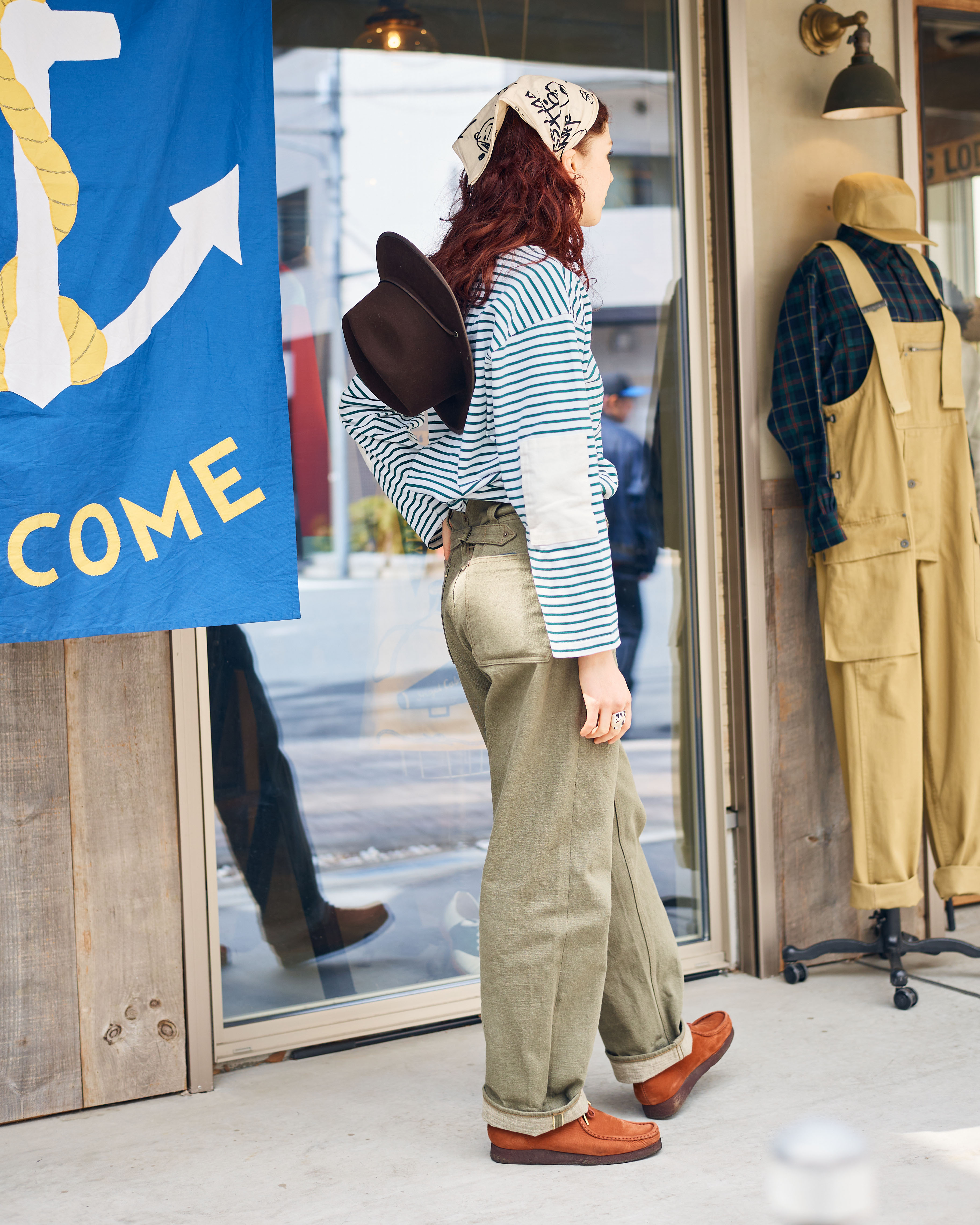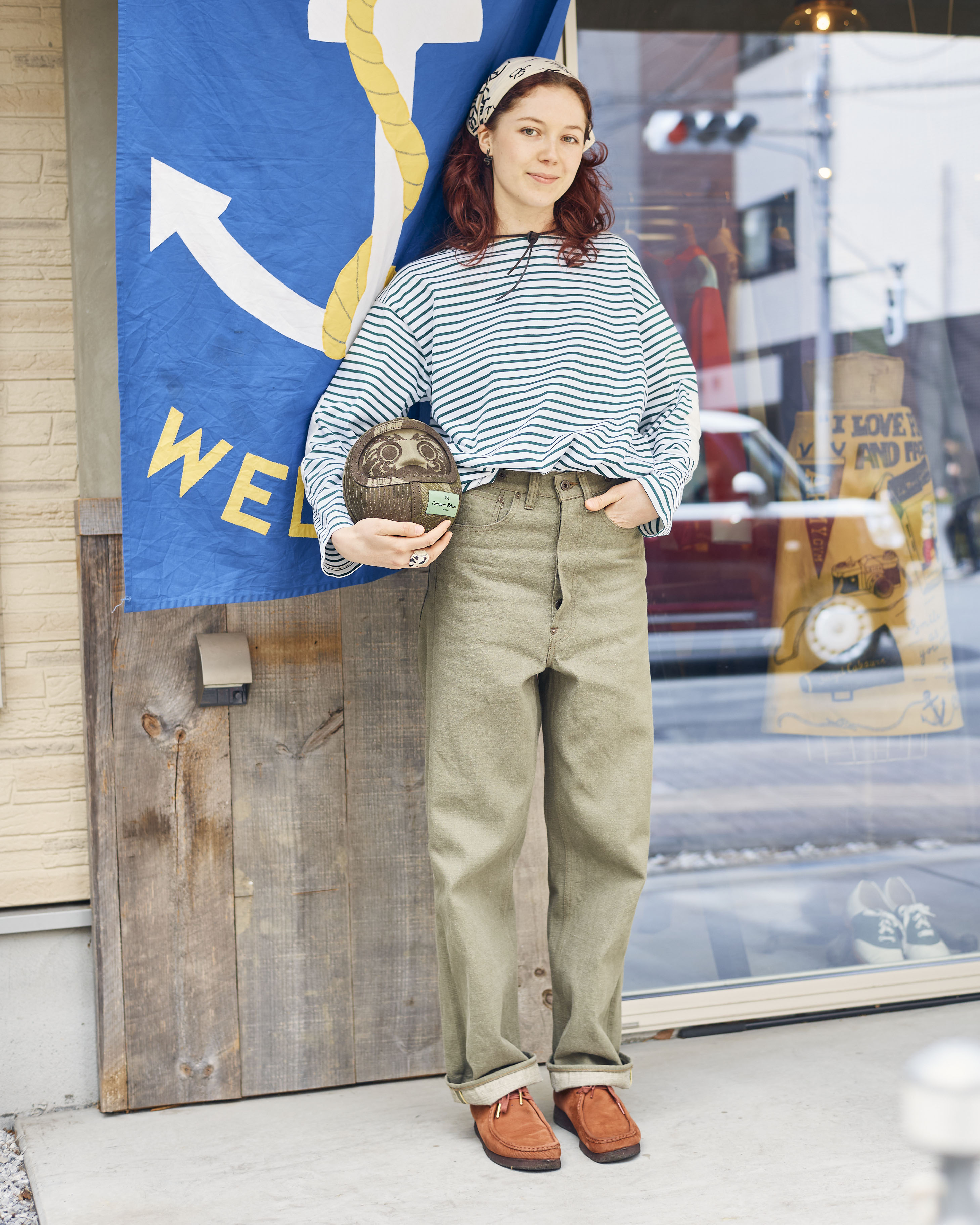 淡いグリーンのデニムと、ブルーのボーダーが新鮮にマッチ。手に持つのはデッドストックの生地が使用されたダルマ。「春はバンダナを巻きたくなります」。