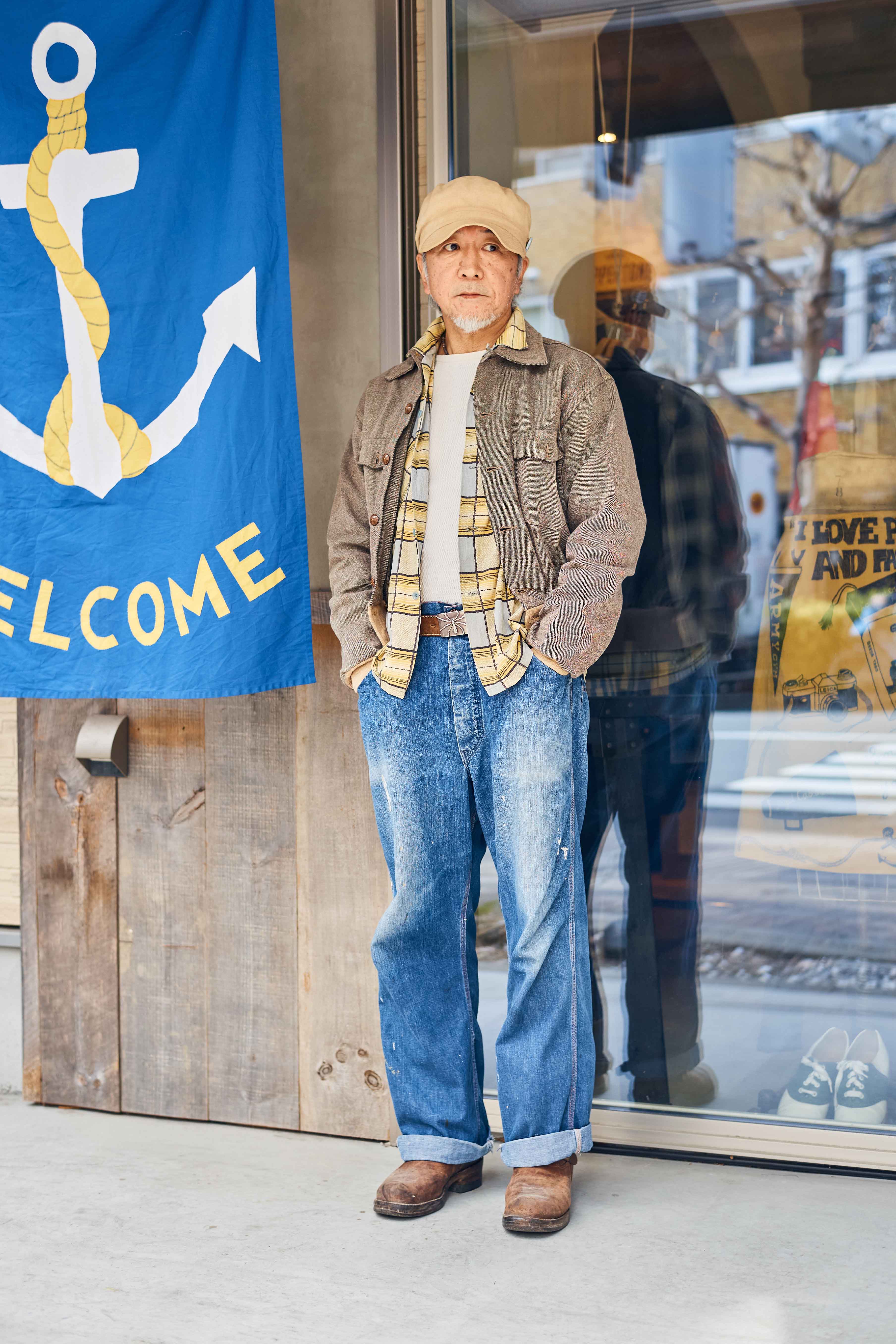 1930〜50年代のヴィンテージでまとめた装いは、ベージュのジャケットに淡いイエローのシャツを合わせることで爽やかな軽やかさをプラス。