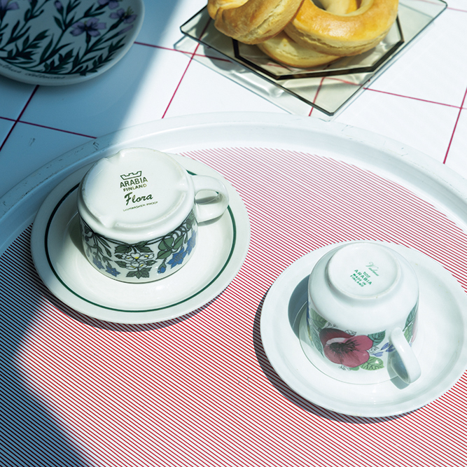 北欧の夏に咲く花、ケシやライラックなどをモチーフにした“ヴァルム”など、フィンランドが誇るアラビアの70 〜80年代に作られた、草花をあしらった食器。せめて日常にこそ花を。右からアラビア ヴァルム カップアンドソーサー エステリ・トムラデザイン¥12,800、アラビア フローラシリーズ コーヒーカップアンドソーサー エステリ・トムラ/ウラ・プロコッペ¥12,800、アラビア ボタニカル ナデシコ プレート エステリ・トムラデザイン¥7,800 / 以上すべてvintage(プレッセ)