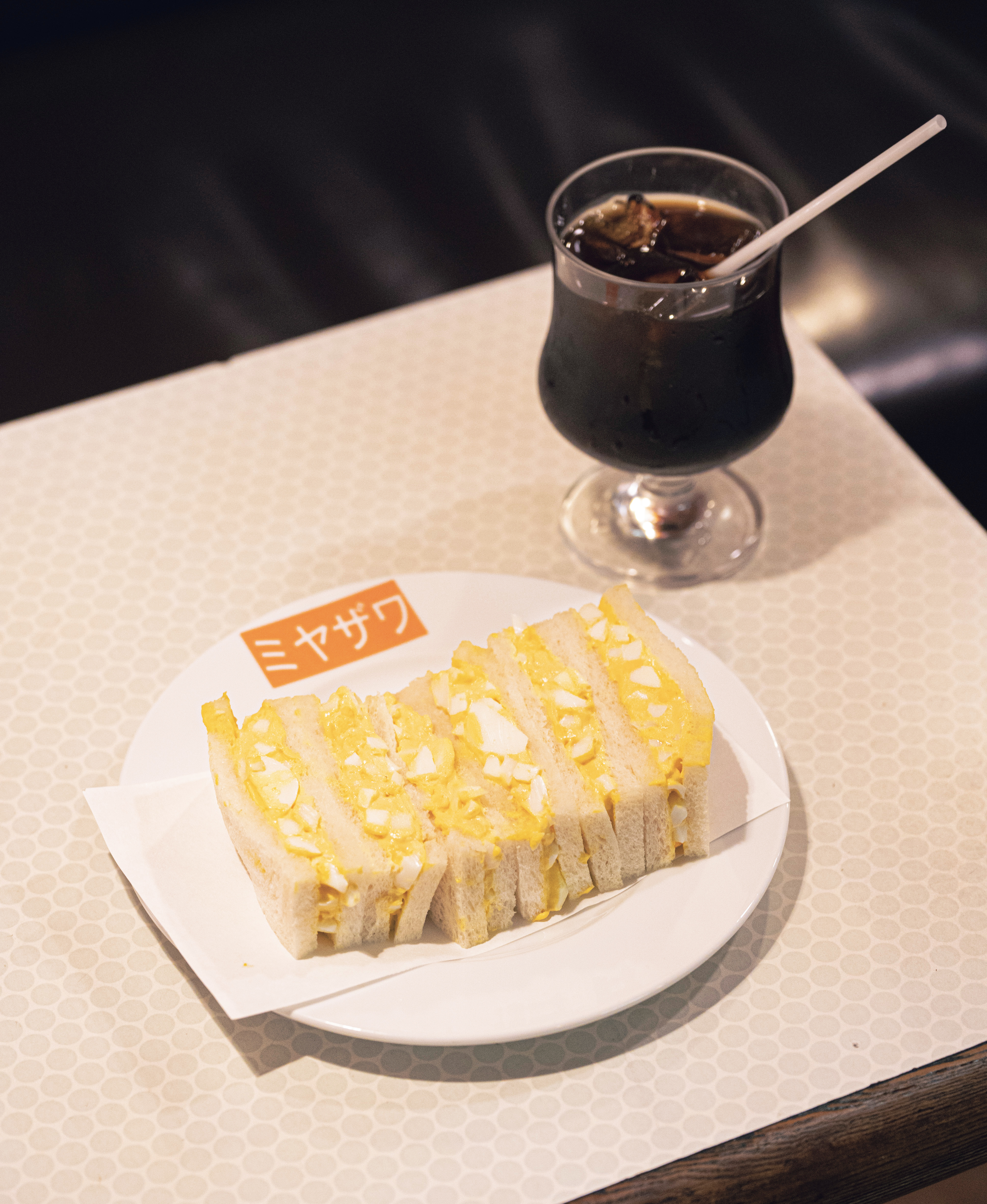 昼はサラリーマンたちの癒しの場、夜は銀座で 働く人々の胃袋を支える憩いの場。昭和31 年創業、銀座の高級クラブ街の中心地で朝4 時 まで営業する老舗喫茶『銀座 みやざわ』。いつからか名物と呼ばれるようになった「たまごサンド」 は、一口サイズのどこか品よい佇まい。具材が 黄色く見えるのは隠し味のからしの色ではなく、 黄身をじっくり潰しながら練っているから。マヨネーズと黄身が一体化したねっとりとした独特の食感と、ごろごろ大きめの白身、そしてたまごの味わいがダイレクトに感じられる薄切りのしっとり食パン。シンプルながらも、また食べたくなってしまう味。たまごサンド¥1,000、アイスコーヒー¥620(セットで100 円引き )
