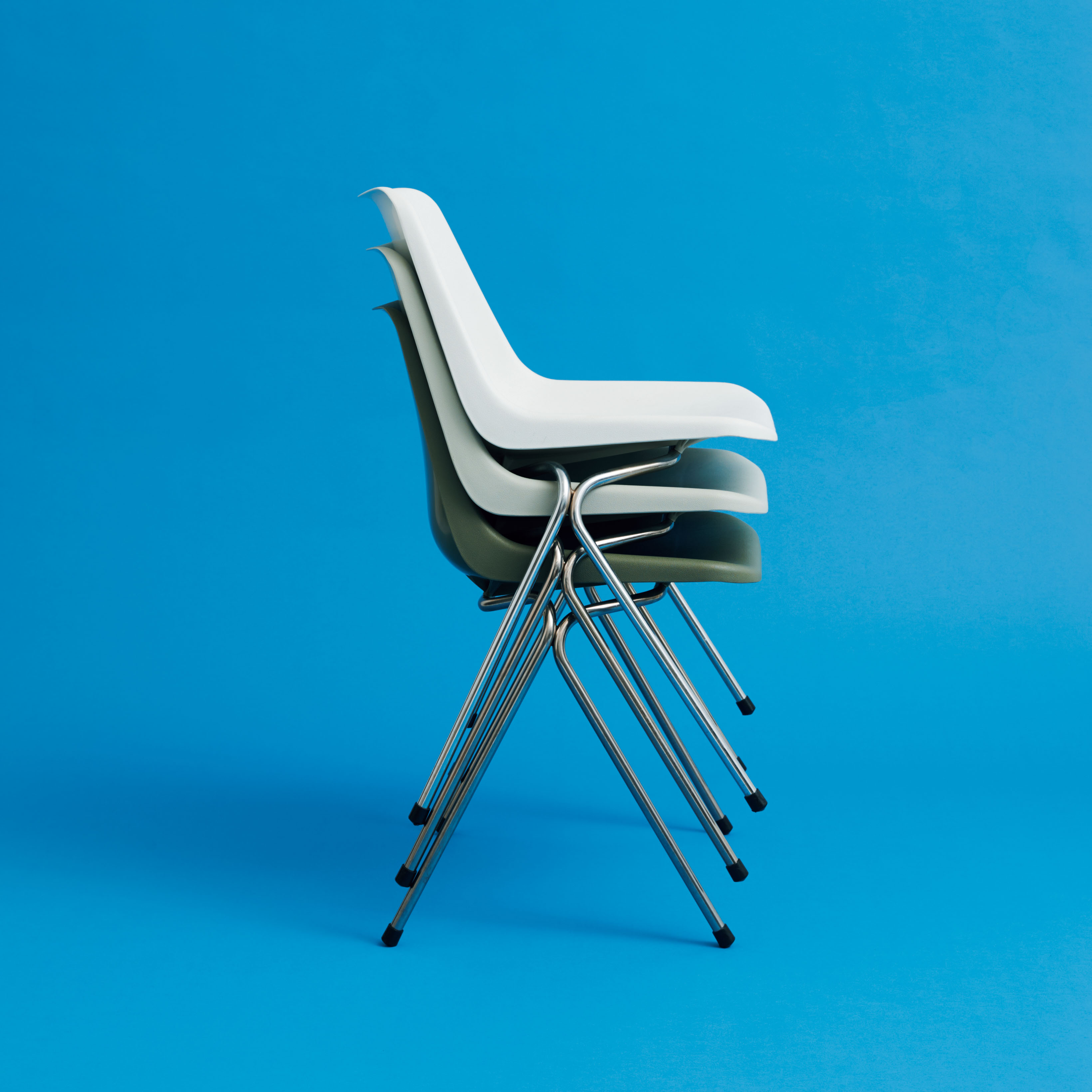 1963年にイギリスの家具メーカー〈ヒル社〉 が、当時の最新素材ポリプロピレンを使用して大量生産したチェア。軽くて丈夫でスタッキングも可能。イス各¥27,500(ピー・ エフ・エス パーツセンター)
