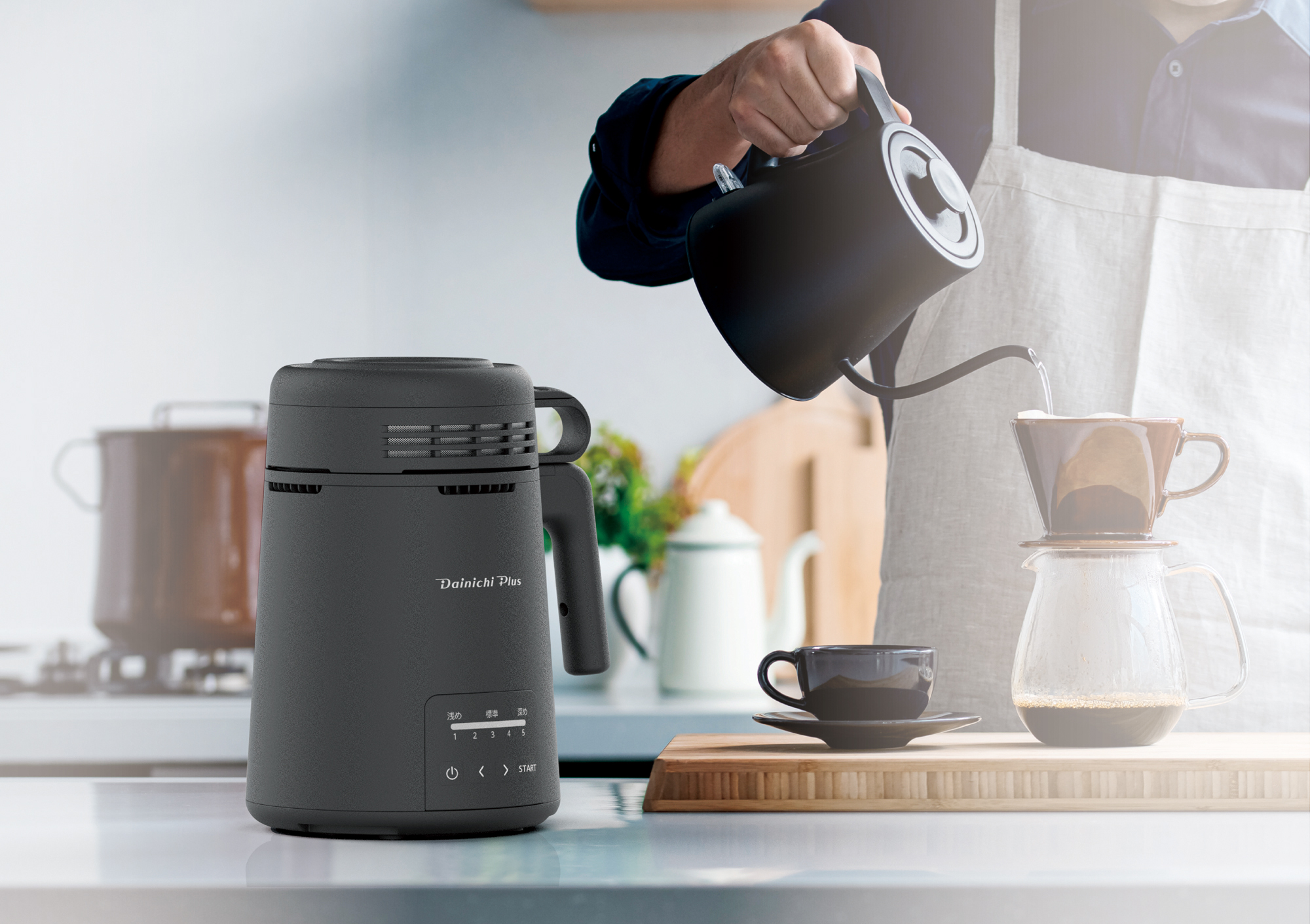Webショップ限定とで販売している「ダイニチ」の家庭用焙煎機は熱風式。使い方もシンプルで生豆を入れて5段階から焙煎レベルを選び、ボタンを押して焙煎するだけ。熱風式焙煎と、温度を管理するセンサーによってムラの少ない焙煎が叶う。