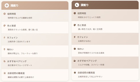 焙煎度を大きく分けると、「浅煎り」「深煎り」があります。同じ生産国、同じ豆を使っていても焙煎度合いによって味わいが変わるのが自家焙煎の魅力です。浅煎り・深煎りの基本的な特徴と味わいの違いをご紹介します。