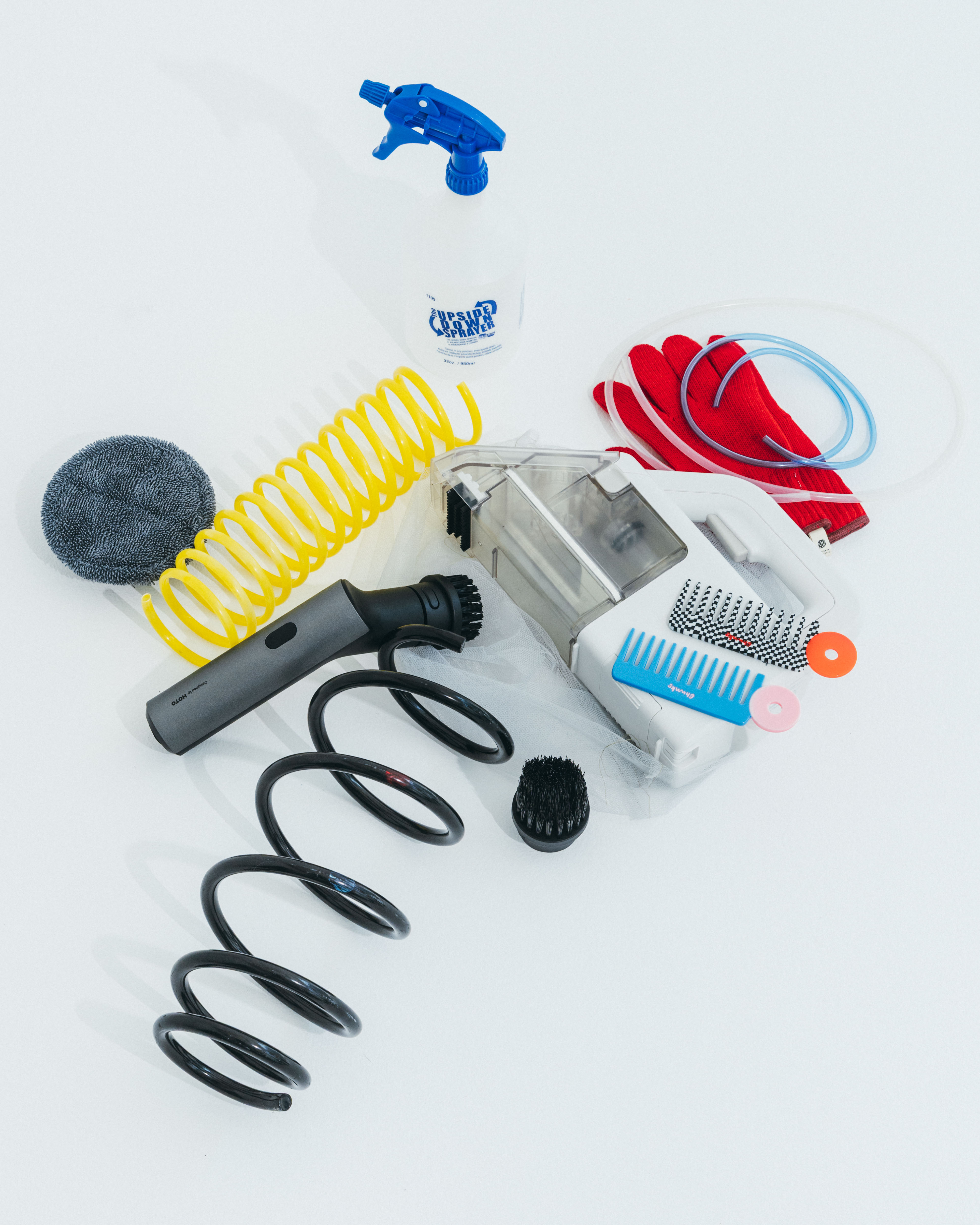 左の黒い家電、回転するブラシ洗浄で汚れを落とす、電動スピンスクラバー¥14,300 / HOTO(セキド)、右の白い家電、布などの染み込み汚れ、カーペットやソファの汚れを水で吸い取るハンディリンサークリーナー¥16,280(変動あり)/ アイリスオーヤマ(電気製品アイリスコール)ヘアコーム各¥3,900 / chunks(モマ デザインストア 表参道)、赤の作業用手袋 No.500 ¥990/サイコロ印(イシカワメリヤス)、スプレーボトル950mL ¥3,186(ピー・エフ・エス パーツセンター)