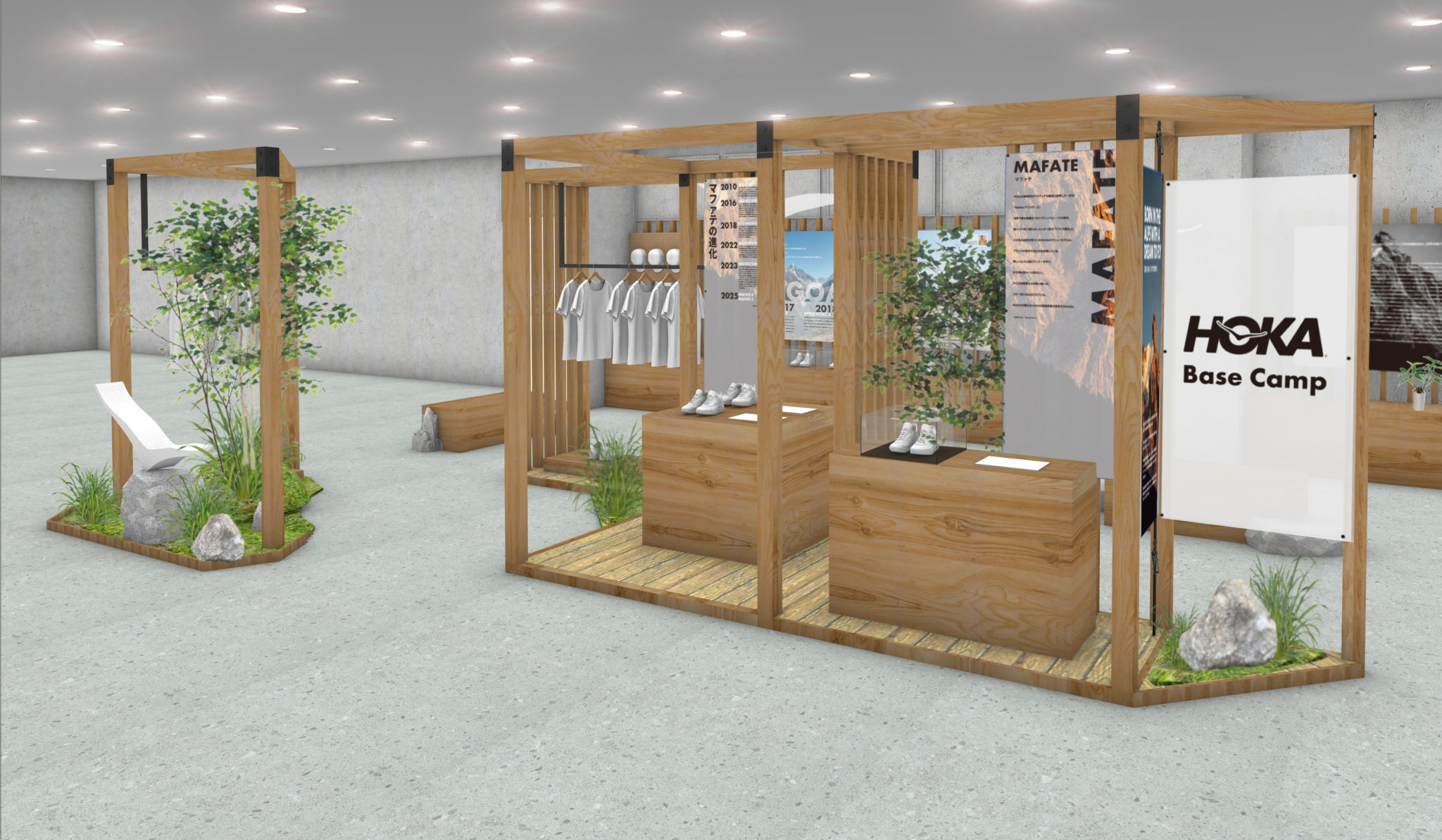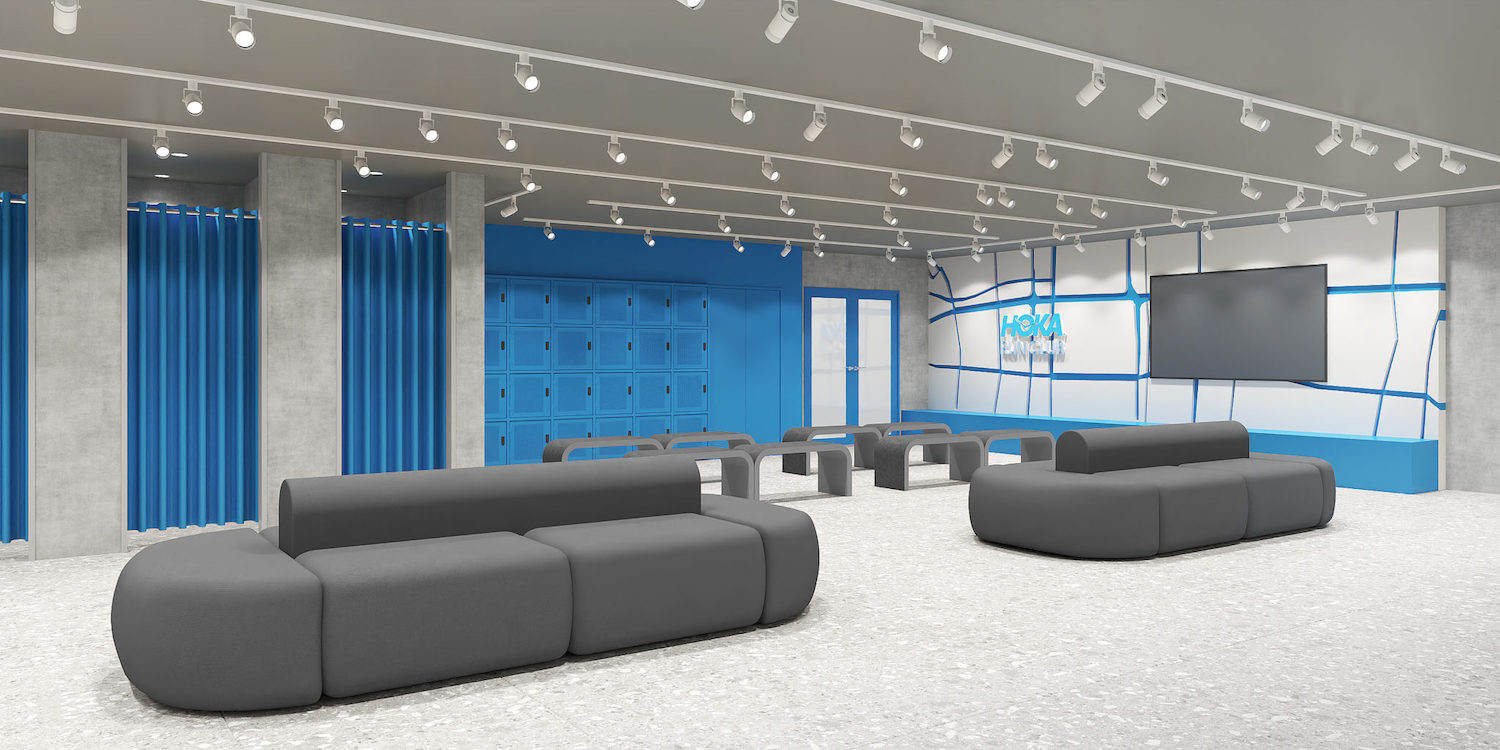 大阪・心斎橋駅から徒歩5分ほど。2フロアで、1階は最新シューズやアパレルが並ぶストアスペースと、ブランドのルーツを感じる「HOKA BASE CAMP」が融合。ブルー×ホワイトのモダンでクリーンな空間と、木目や岩を使った自然を感じる温かみのある空間で、《ホカ》の世界観を余すことなく体感できます。2階はランナーのための「HOKA RUN CLUB」スペース。試走やイベントが楽しめる特別な空間になっています。