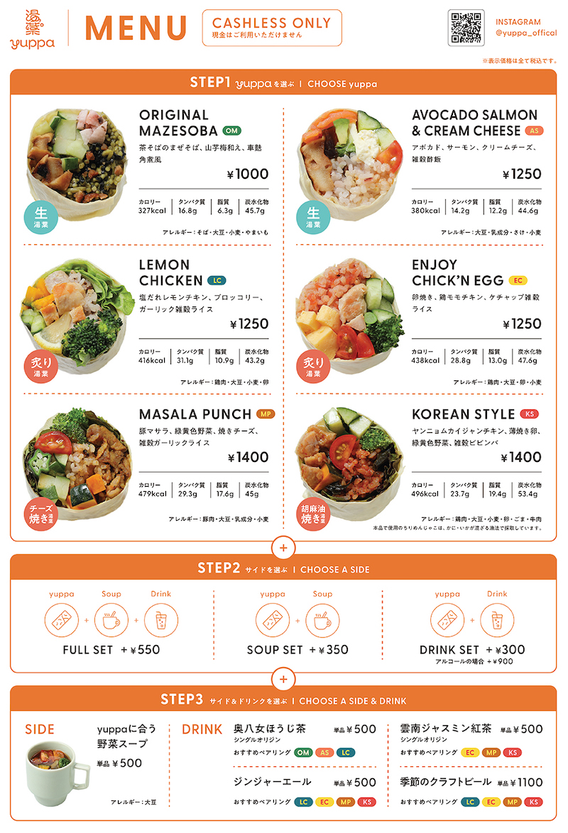 ウォーキングの合間にみなさんにお楽しみいただくのは、今じわじわと注目を集めつつあるヘルシーファストフードブランド《yuppa(ユッパ)》。京生湯葉で「食べる楽しみ」と「栄養」をぐるっと巻いた新感覚のフードを、1月にオープンしたばかりの表参道のショップで味わえちゃいます! フレーバーは、1番人気で湯葉本来の味わいを楽しめる茶蕎麦のまぜそばから、生湯葉を韓国旅行に連れて行ったというユニークなテーマの韓国風ビビンバスタイルまで、全部で6種類。今回は下にあるメニューからお好きなフレーバーをお選びいただけますので、応募時にセレクトしてくださいね。