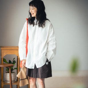バランスのいいモノカラーの配色で、端正なイメージにまとめたシンプルコーディネート。ゆったりめカットソーと素足を覗かせる足元のサンダルとが醸し出す、程よいラフさが丁度いい。