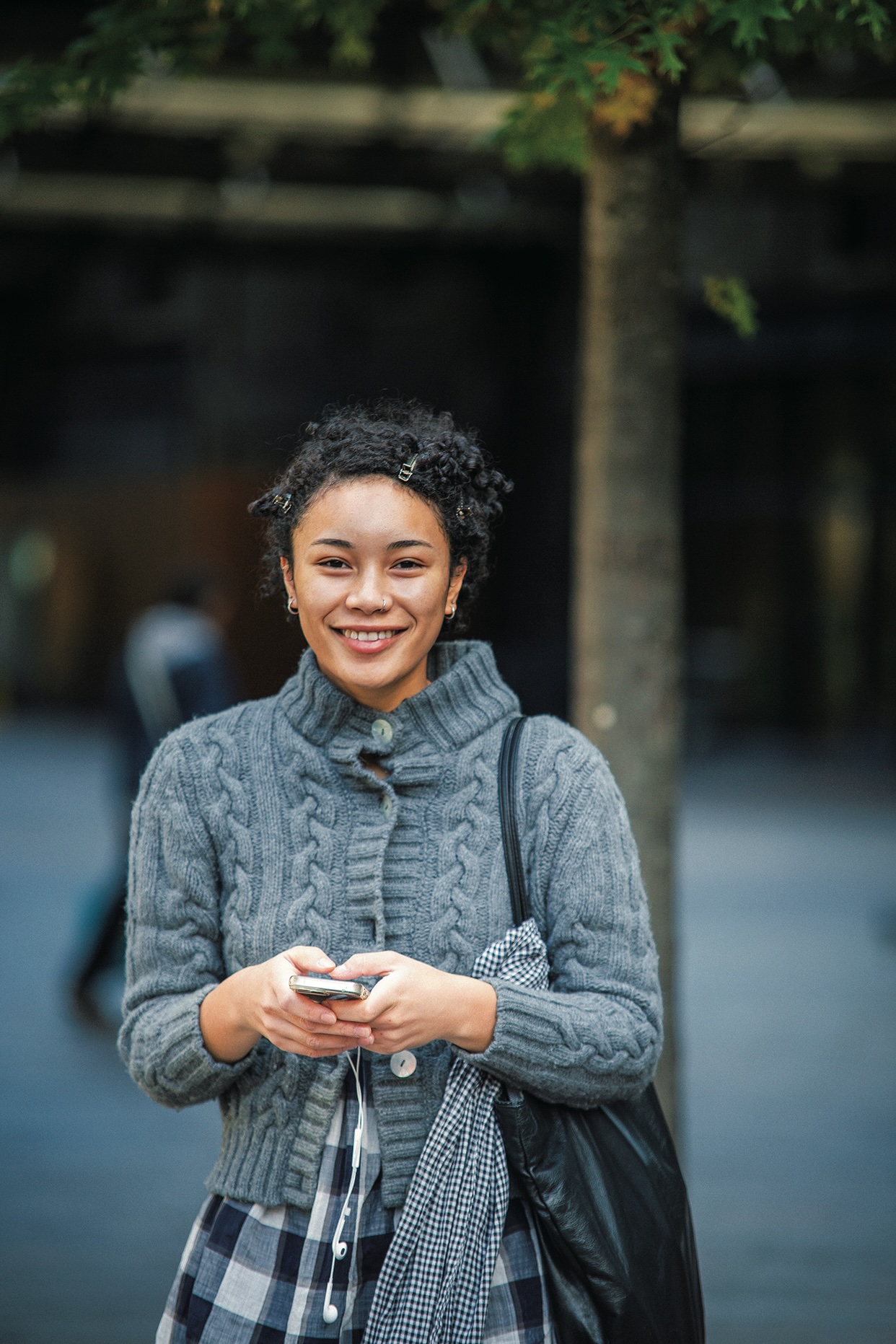 ヘアセットでよく使われるダック・カールピンをアクセサリーとして活用。左右に合計5つ付けてもトゥーマッチにならないのは、ヘアのボリューム感とバランスが取れているから。