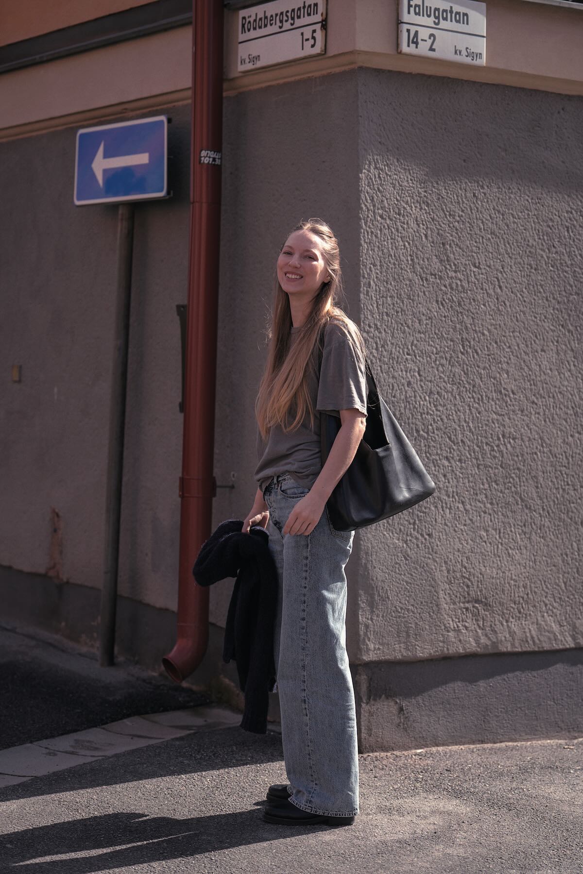 手に持ったジャケット、Tシャツ、デニムパンツ、シューズ/以上すべてOur Legacy、バッグ/PRADA